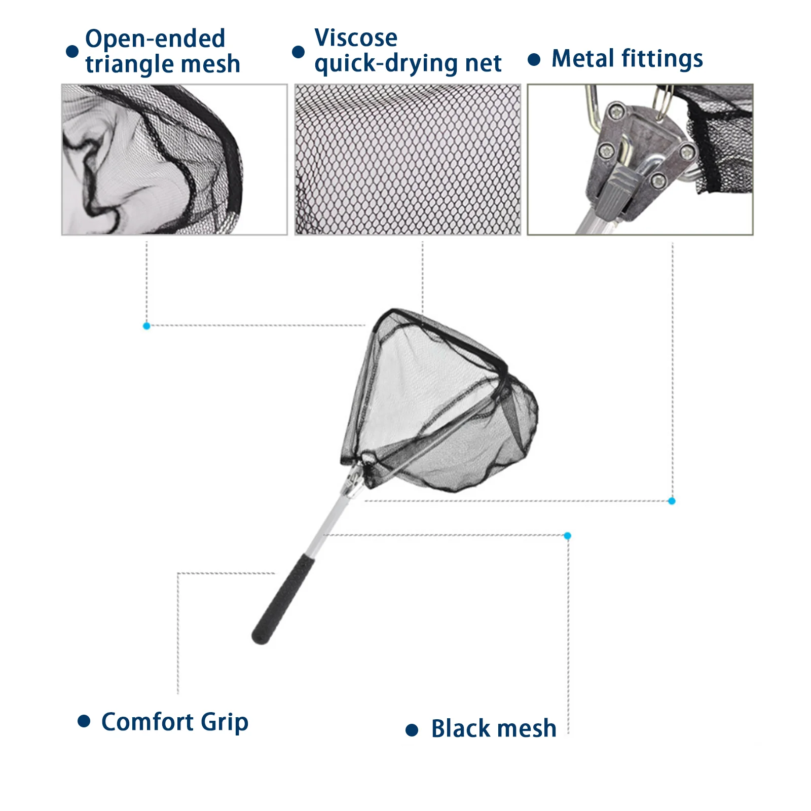 5. Las pequeñas redes de pesca están hechas de una red resistente y un mango de aluminio; Garantizar un rendimiento a largo plazo y un uso confiable.¡Adecuado para pescar peces pequeños en agua salada y dulce!