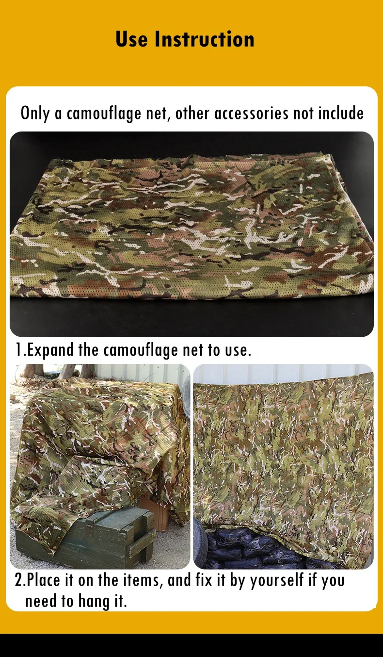 ●Multiustedsicamouflage net: persianas de caza, persianas de tierra, observación de vida silvestre, simulación de campo CS, deportes al aire libre, aplicaciones, salas de exposiciones e incluso sombra del sol, barrera de privacidad, etc.Este material se puede utilizar para todo tipo de cosas..