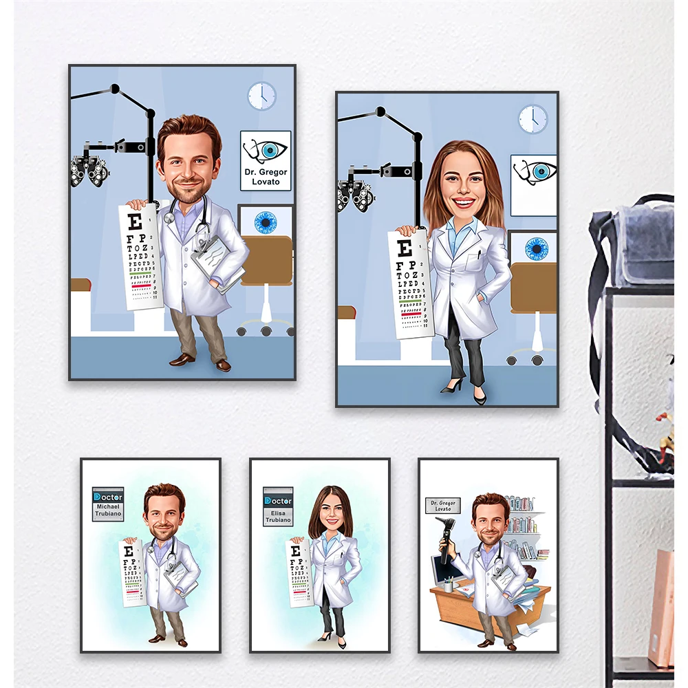Regalo personalizado de médico ocular, ophtalmólogo personalizado, póster de médico masculino, impresión de caricatura de Doctor ocular, retrato de dibujos animados, pintura en lienzo
