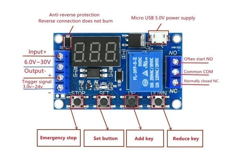 Aspectos destacados del módulo:1.La fuente de alimentación de amplio voltaje (6 ~ 30 V) admite fuente de alimentación micro USB de 5,0 V, lo cual es muy cómodo de usar;2.La interfaz es clara y simple, potente, fácil de entender y casi satisface todas sus necesidades;3.Hay una función de parada de emergencia clave (tecla STOP), con protección de conexión inversa, la conexión inversa no se quema;4.Se pueden configurar diferentes parámetros OP, CL, LOP, estos parámetros son independientes entre sí y se guardan por separado;5.Todos los parámetros establecidos se guardan automáticamente después del apagado.Modo de funcionamiento:P1: Después de activar la señal, el relé se enciende durante el tiempo OP y luego se apaga; durante el tiempo OP, las siguientes operacionesP1.1: La señal no es válida cuando se activa nuevamenteP1.2: La señal se activa nuevamente para volver a sincronizarP1.3: La señal activa el reinicio nuevamente, el relé se desconecta y la sincronización se detiene;P-2: dé la señal de disparo, después de apagar el relé durante el tiempo CL, el relé se enciende durante el tiempo OP, una vez completado el tiempo, el relé se apaga;P3.1: dé la señal de disparo, después de encender el relé durante el tiempo OP, el relé se desconectará durante el tiempo CL y luego realizará un ciclo de las acciones anteriores, dará la señal nuevamente en el ciclo, el relé se desconectará y dejará de cronometrar ;se puede configurar el número de ciclos (LOP);P3.2: No es necesario activar la señal después del encendido, el tiempo OP del relé está activado, el tiempo CL del relé está desactivado, las acciones anteriores se ciclan; se puede configurar el número de ciclos (LOP);P-4: Función de retención de señal.Si hay una señal de disparo, el temporizador se borra y el relé permanece encendido; cuando la señal desaparece, el relé se desconecta después de cronometrar el OP; durante el cronometraje, hay otra señal y el cronómetro se borra;Parámetros del producto:1: Voltaje de funcionamiento: 6-30 V compatible con fuente de alimentación micro USB 5,0 V2: Fuente de señal de disparo: disparador de alto nivel (3,0 V-24 V) La tierra de la señal y la tierra del sistema no están en la misma tierra para mejorar la capacidad antiinterferencias del sistema (también se puede cortocircuitar a tierra común )3: Capacidad de salida: puede controlar equipos dentro de DC 30v 5A o AC 220v5A4: Corriente de reposo: 20 mA corriente de trabajo: 50 mA5: Vida útil: más de 100.000 veces; temperatura de trabajo: -40—85°C; Tamaño: 6,2*3,8*1,7 cm6: Con aislamiento de optoacoplador, capacidad antiinterferencias mejorada, placa de circuito de grado industrial, configuración de parámetros para siempre después de un corte de energíamemoria.Atención especial: la salida de relé es un contacto pasivo, una salida descargada y controla la función de encendido y apagado de una línea.