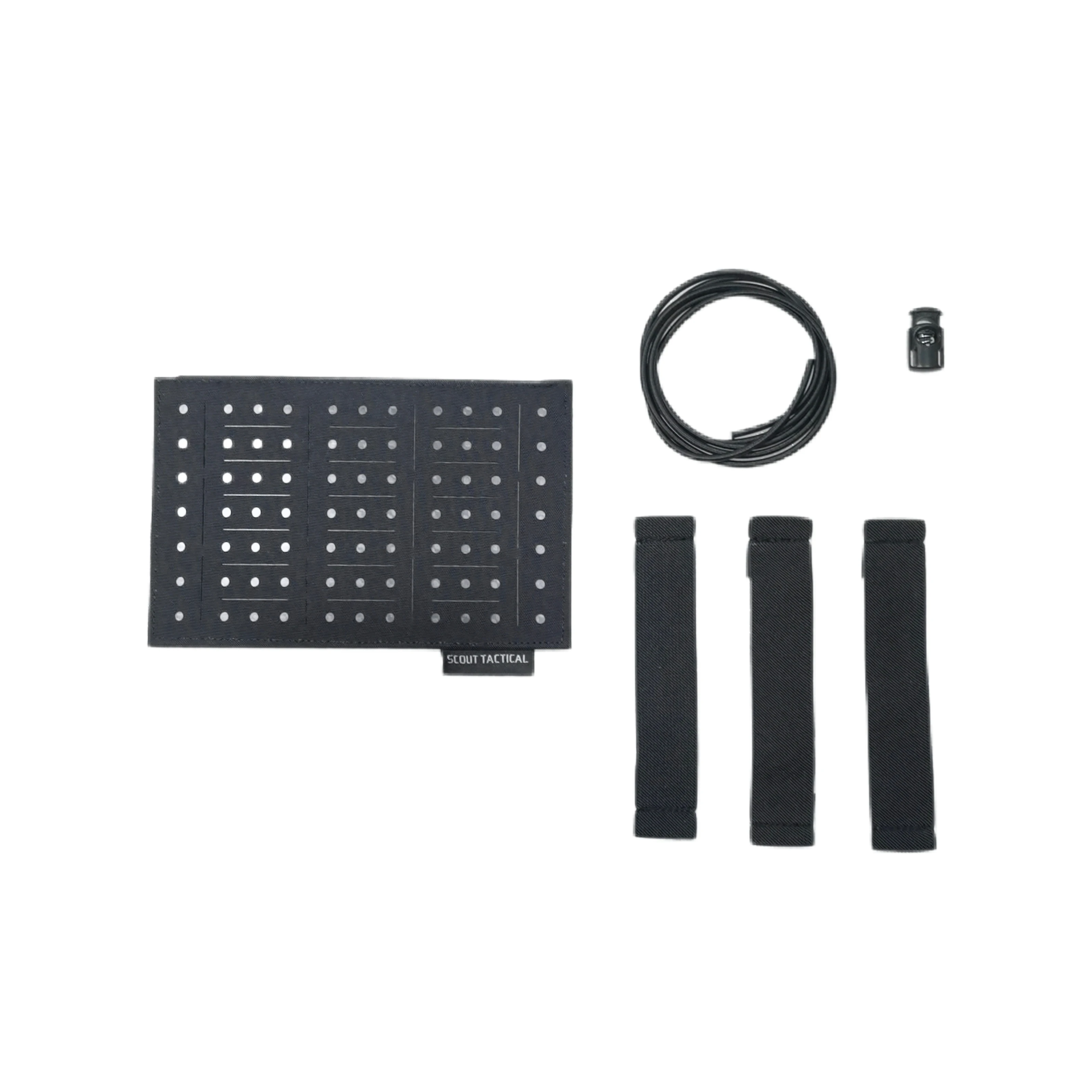 Se puede ver como un bolsillo de tela de doble cara cortado con láser con un gancho y bucle en la parte posterior que se puede fijar a la superficie de la piel de la mochila, un panel cortado con láser en la parte delantera que se puede asegurar con bandas elásticas o cuerdas, y un bolsillo entre dos capas de tela que puede acomodar un panel de fibra de carbono libre para soportar o sujetar artículos delgados.