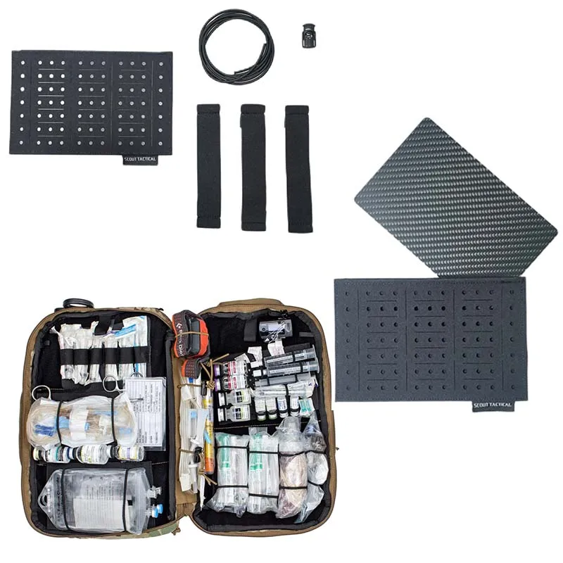 Se puede ver como un bolsillo de tela de doble cara cortado con láser con un gancho y bucle en la parte posterior que se puede fijar a la superficie de la piel de la mochila, un panel cortado con láser en la parte delantera que se puede asegurar con bandas elásticas o cuerdas, y un bolsillo entre dos capas de tela que puede acomodar un panel de fibra de carbono libre para soportar o sujetar artículos delgados.
