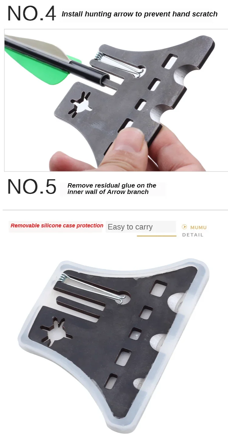 Descripción: Herramienta manual multifunción para tiro con arco Evite que sus manos se dañen al instalar o desmontar la cabeza de la flecha Retire el fleje de la cola de la flecha Ayuda a ajustar las boquillas del arco compuestas Limpie rápidamente el pegamento dentro de la flecha Características: Material: aleación de aluminio Tamaño (largo x ancho x alto): Aprox.10x7x0,5 cm Peso: alrededor de 100 g El paquete incluye: 1 herramienta de flecha multifuncional