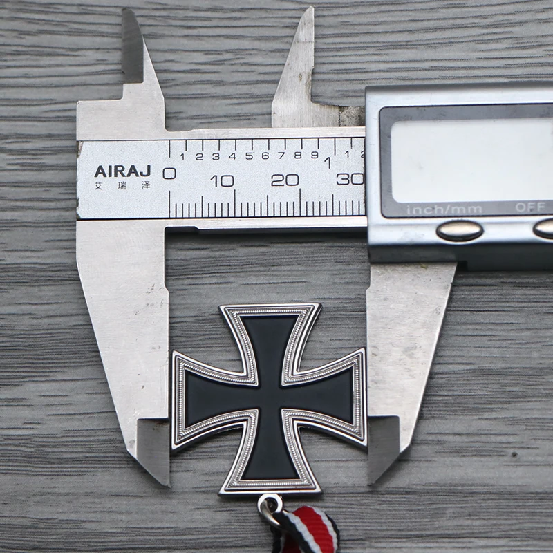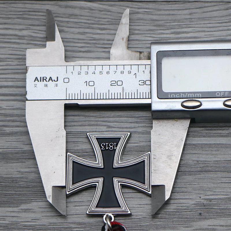 Medalla de cruz de hierro: Replica el diseño clásico del 1813, con coloración negra y plateada que resalta su robustez.La marca del año "1813" restaura el peso histórico, y la correa tejida roja, negra y blanca hace eco del diseño de la cinta de medalla.Es una presentación clásica de símbolos de honor militares alemanes.