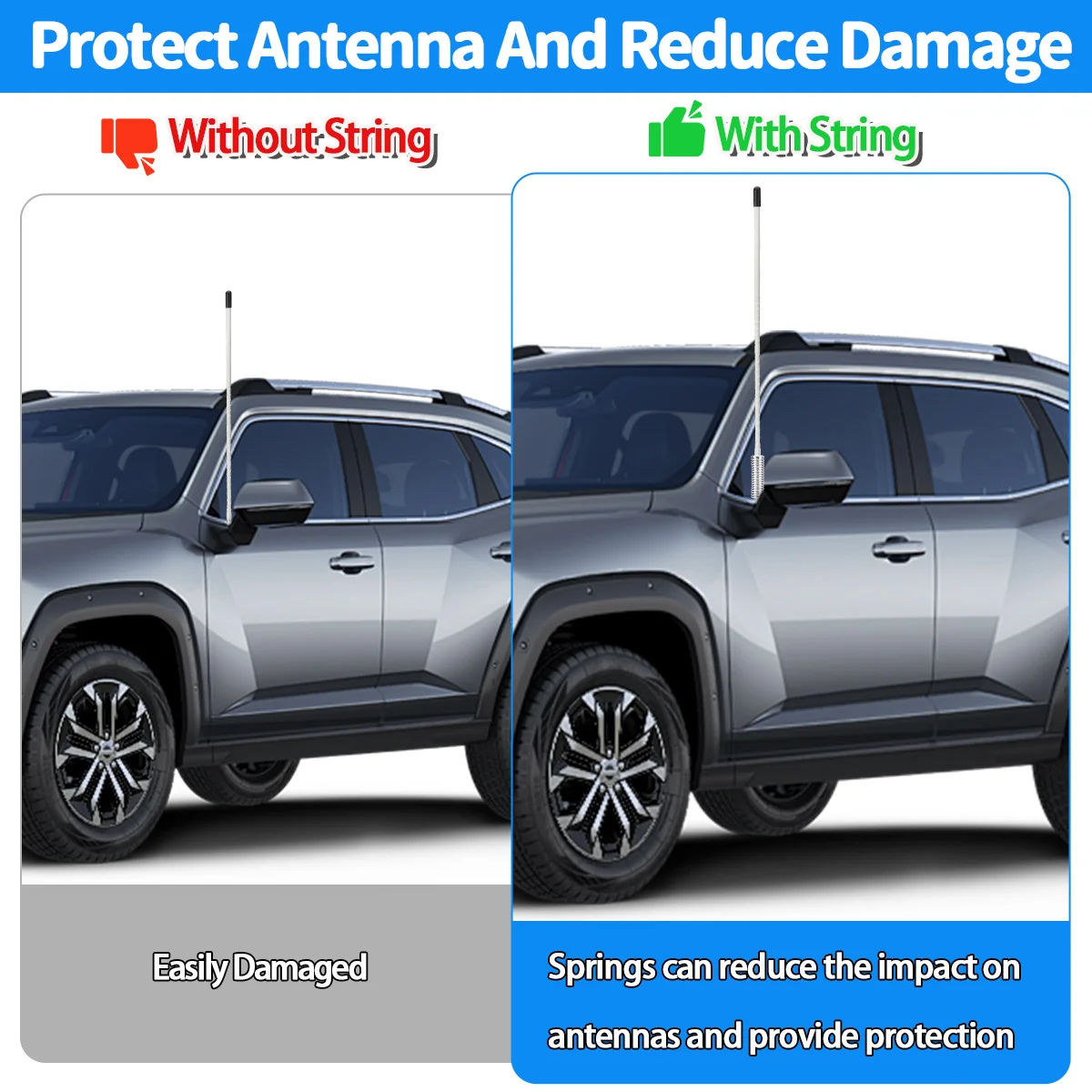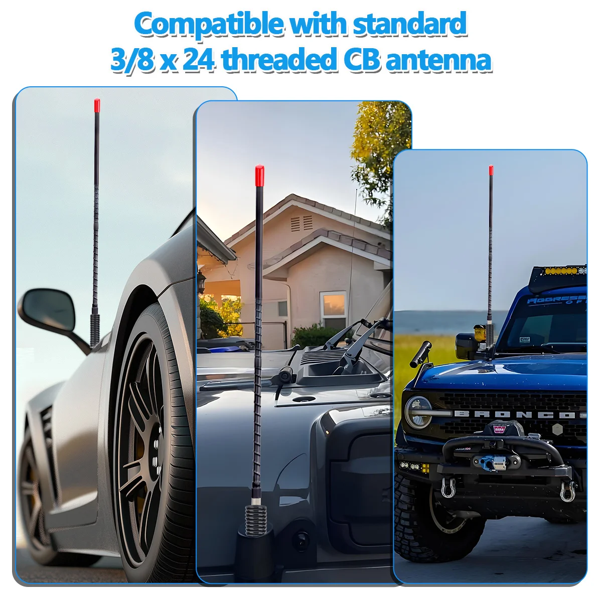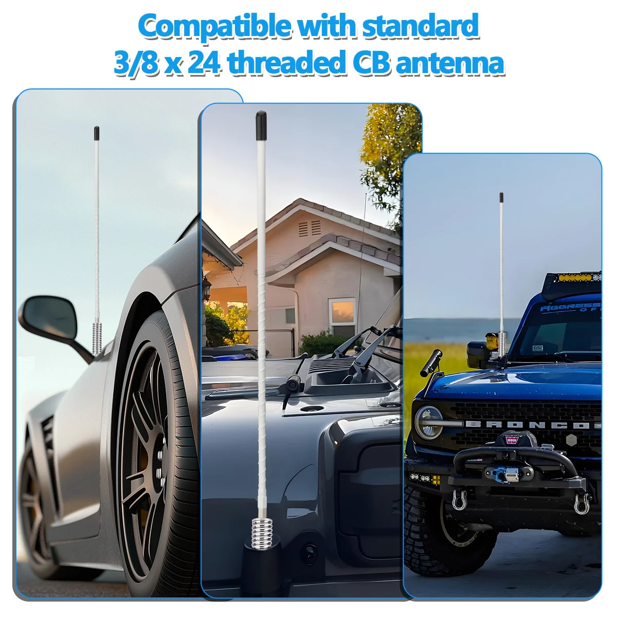 Cuando el resorte de instalación se impacta o se agita, no se deformará.Nuestro resorte de antena CB está hecho de acero inoxidable duradero, que es muy resistente y duradero.La antena de radio CB montada en móvil/vehículo se puede instalar con antenas largas estándar de hasta 3/8 de pulgada x 24 cables, lo que la convierte en una opción ideal para vehículos todoterreno, camiones y furgonetas.