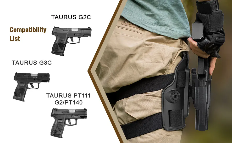 Material de alta calidad: Taurus G2C, G3C, PT111, G2, PT140, la plataforma de la funda para pierna caída está hecha de polímero de alta calidad, suave, resistente al desgaste y no se raya fácilmente.La correa de ajuste está hecha de material de alta elasticidad y alta viscosidad, lo que aumenta la vida útil del producto.