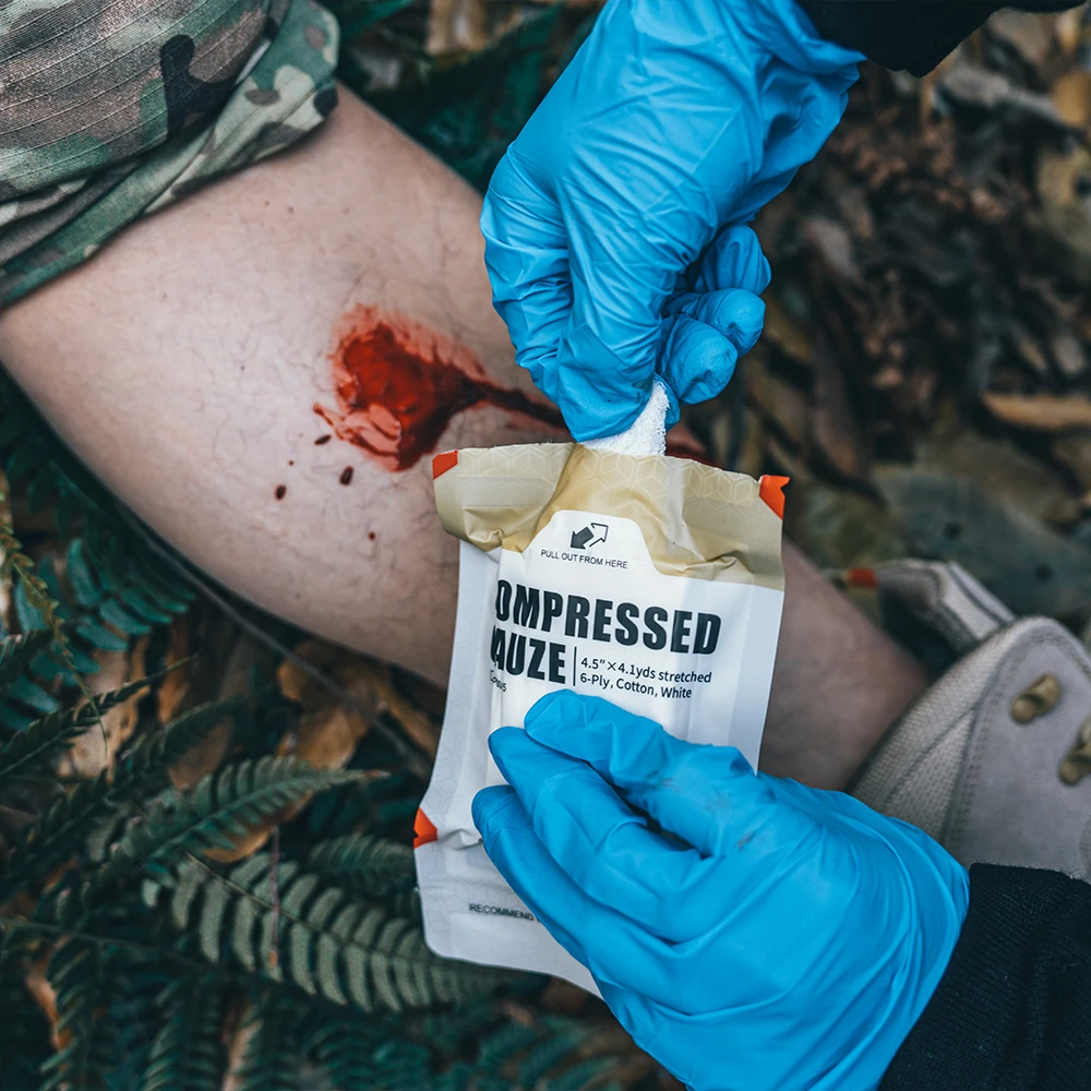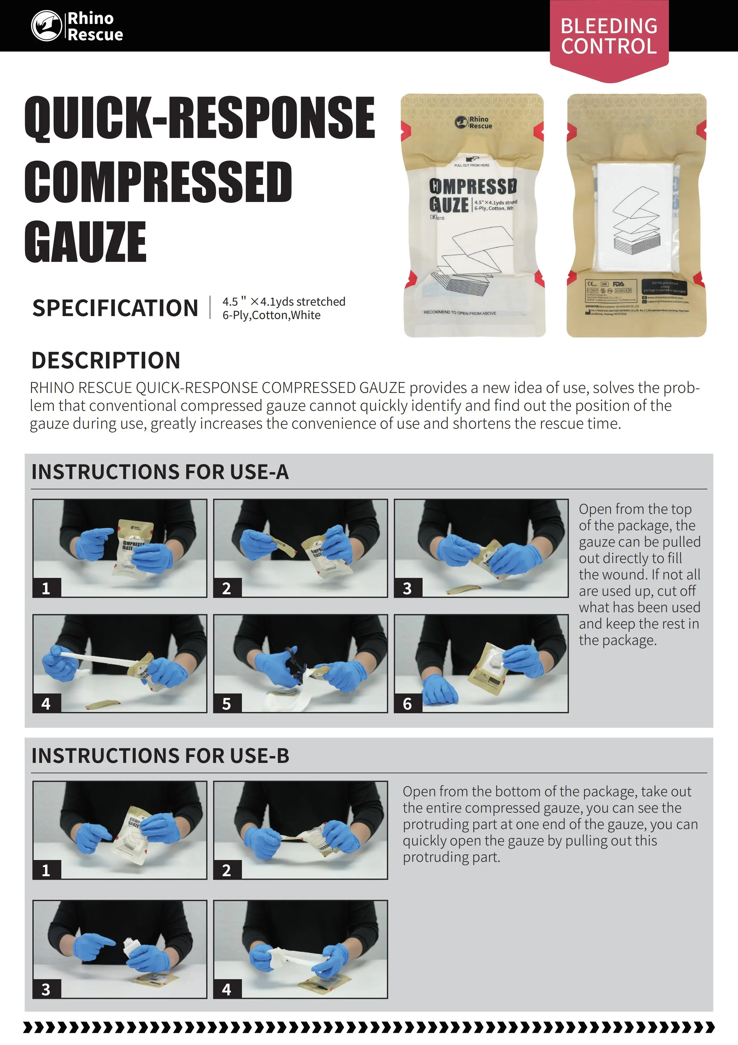 RHINO RESCUE QUICK-RESPONSE COMPRESSED GAUZE provides a new idea of use, solves the problem that conventional compressed gauze cannot quickly identify and find out the position of the gauze during use, greatly increases the convenience of use and shortens the rescue time.