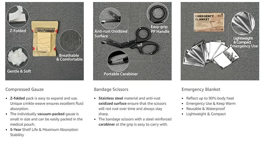 【Kit de trauma IFAK 】El Kit de trauma contiene los dispositivos de primeros auxilios necesarios probados en combate para el estancamiento del flujo sanguíneo de heridas de hemorragia traumática en situaciones de emergencia prehospitalarias. El kit para detener el sangrado proporciona un acceso rápido a los productos de control de sangrado y salva vidas de hemorragia grave en incidentes.