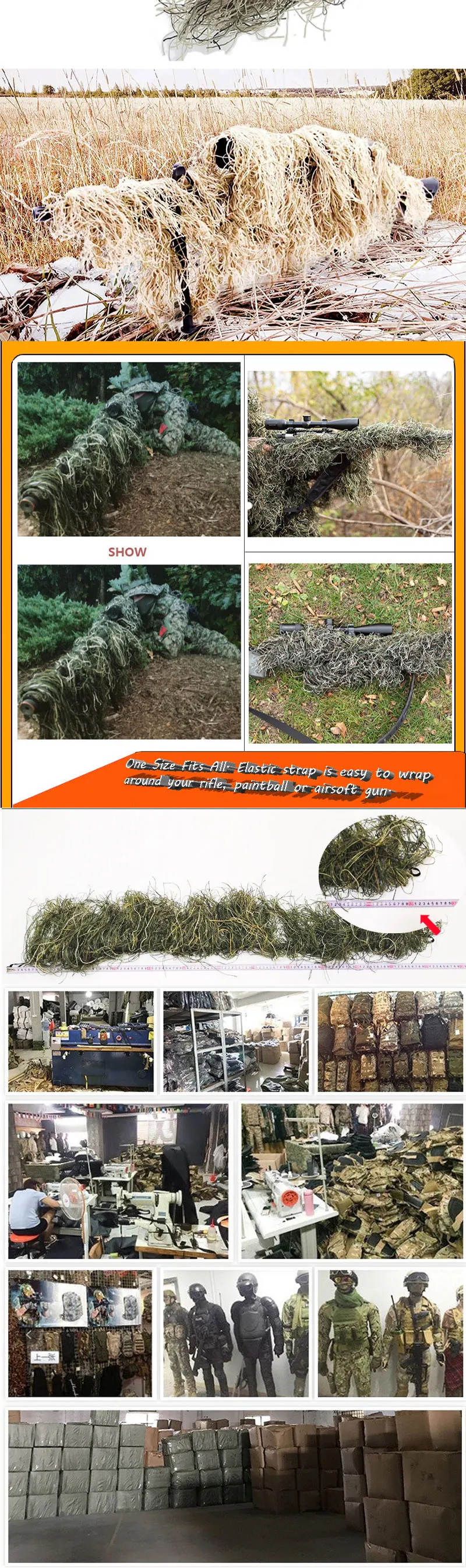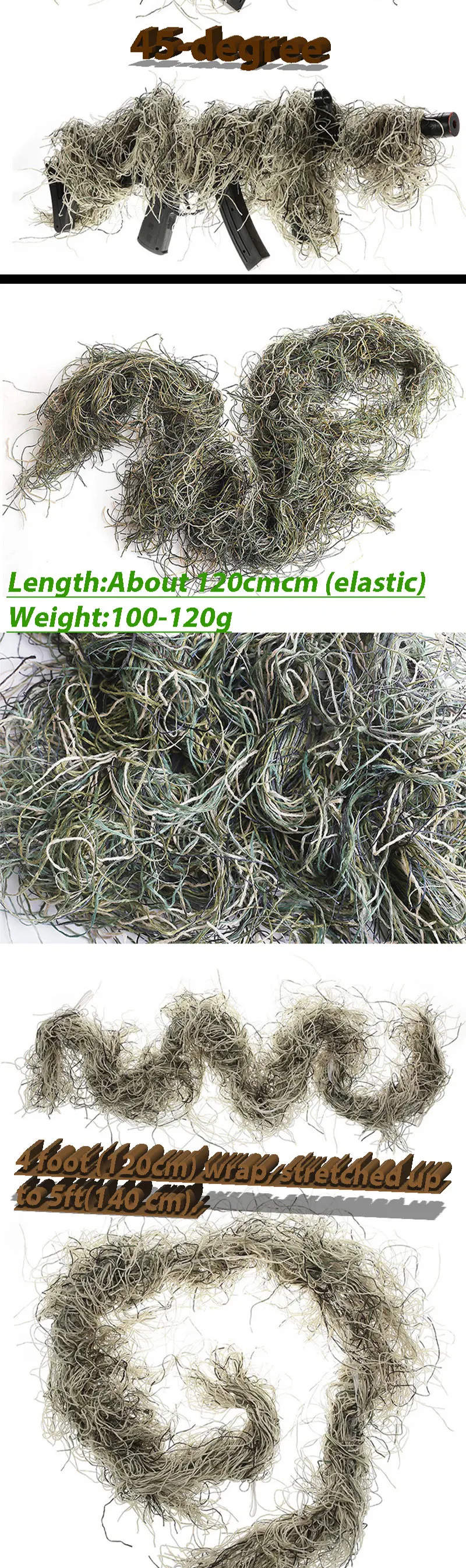 Material: Made of durable synthetic fiber thread with color patterns that match most ghillie suit. This is the versatile and practical choice for your rifle concealment needs.