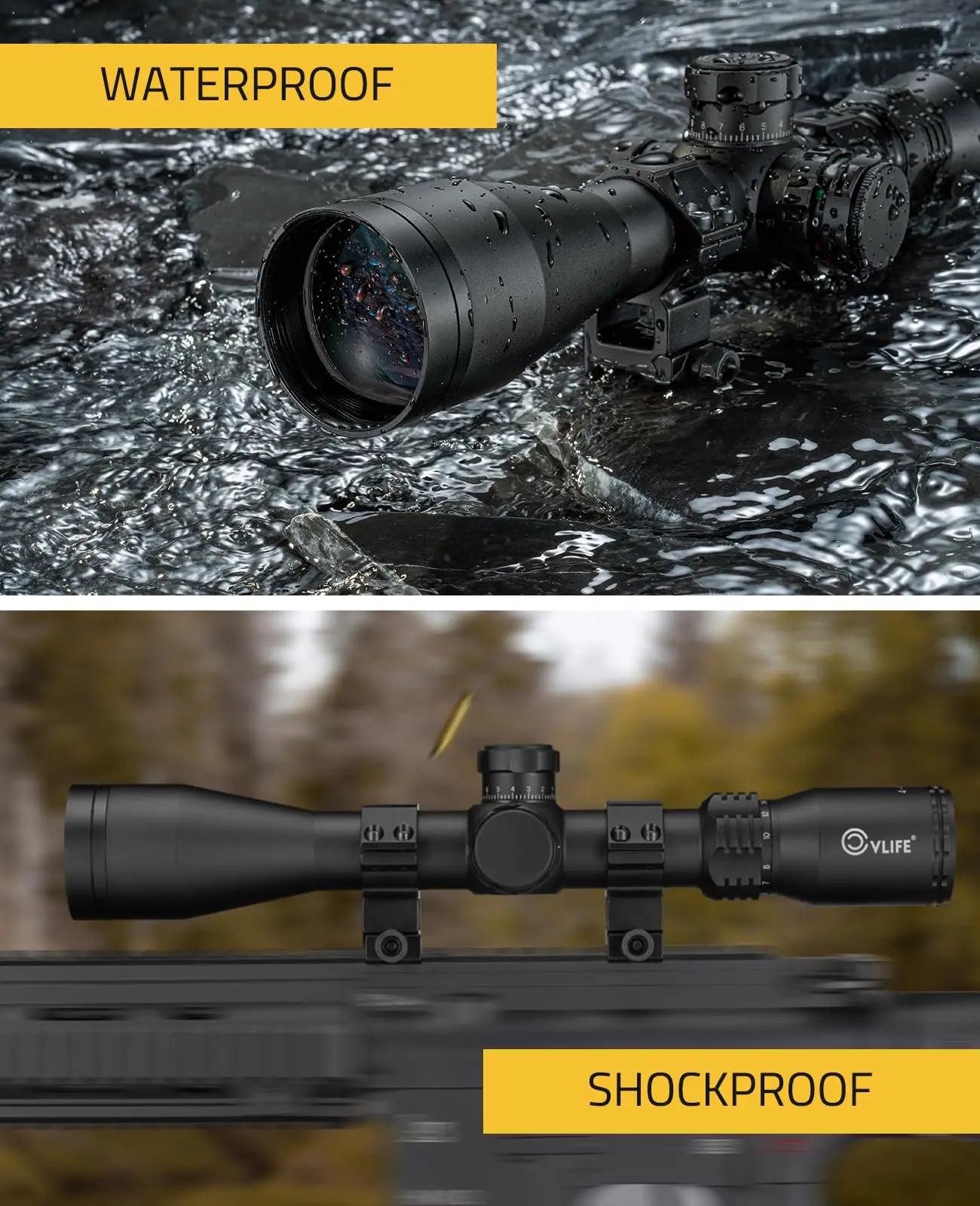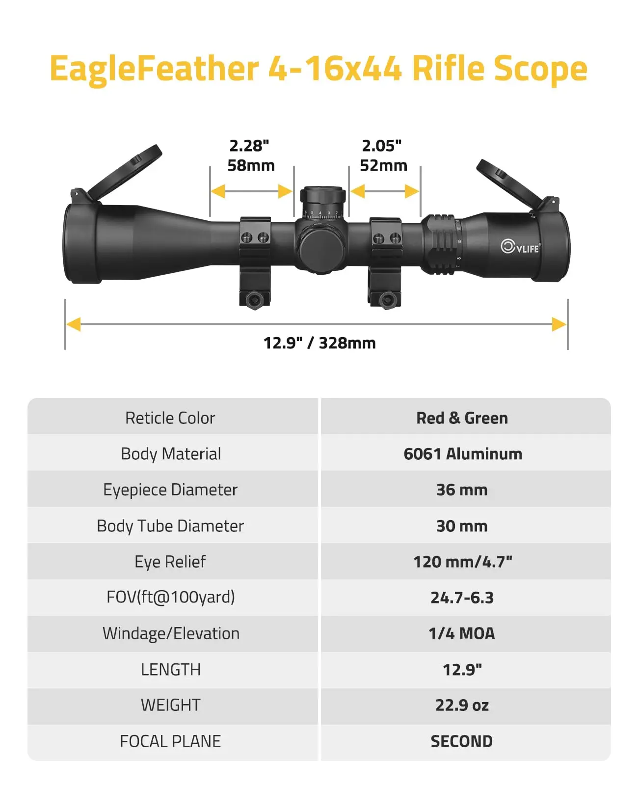 Alcance de ultra alto rendimiento 4-16x: CVLIFE Eagle Feather 4-16X44 Hunting Scope proporciona un rendimiento versátil para apuntar a corto y medio alcance, incluyendo Esfera de enfoque de paralaje lateral, iluminación de doble color, retícula de punto medio, y accesorios como sombrillas y cubiertas abatibles que admiten el uso en entornos hostiles.