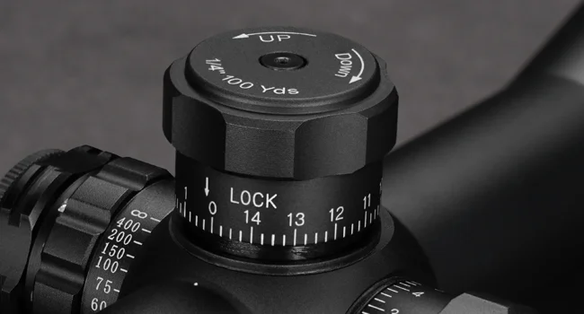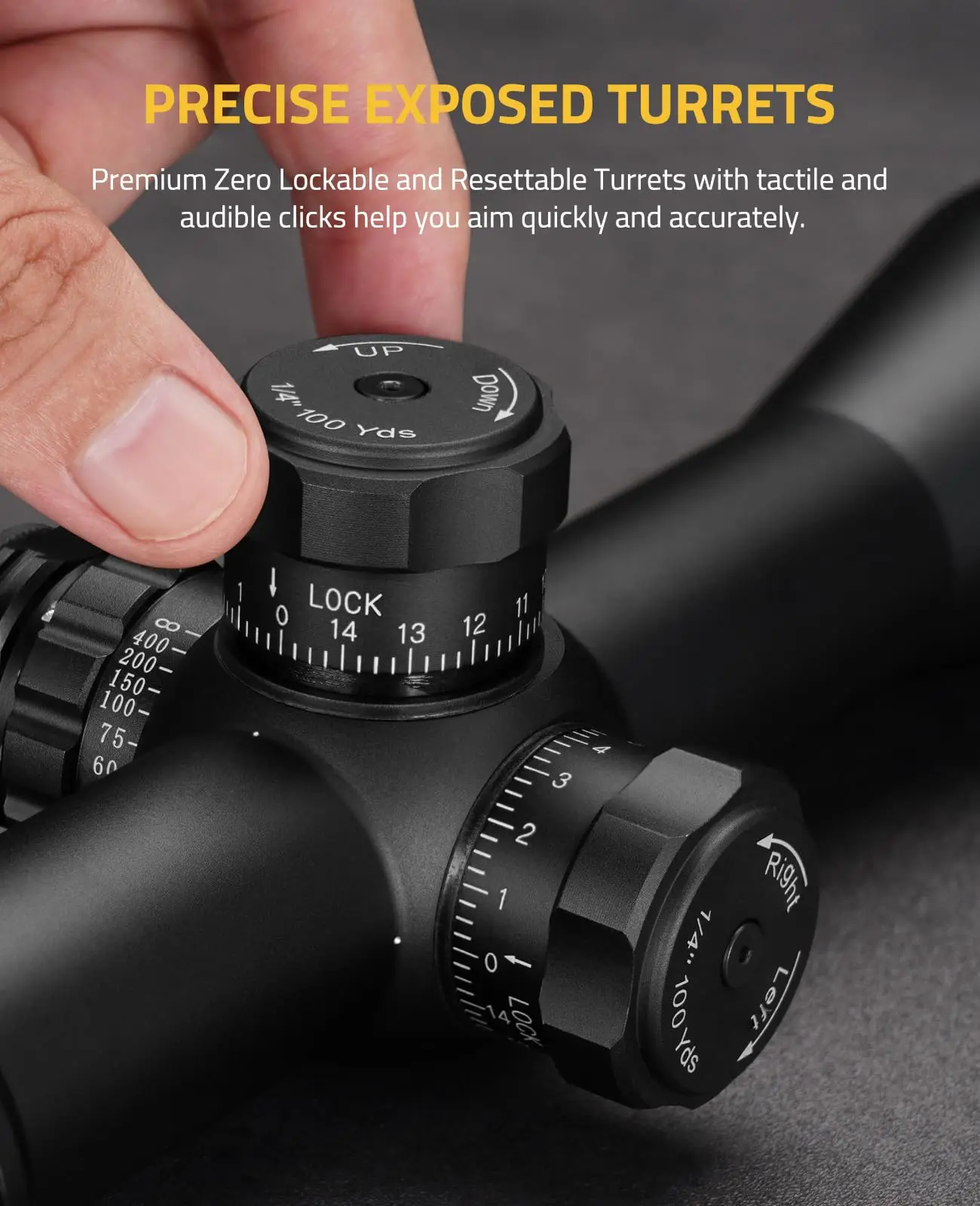 Torretas de bloqueo expuestas de precisión: las torretas expuestas permiten ajustes rápidos y precisos de elevación con los dedos, con clics táctiles y audibles. Los ajustes rápidos con bloqueo y restablecimiento a cero son útiles en situaciones que requieren reacciones rápidas.