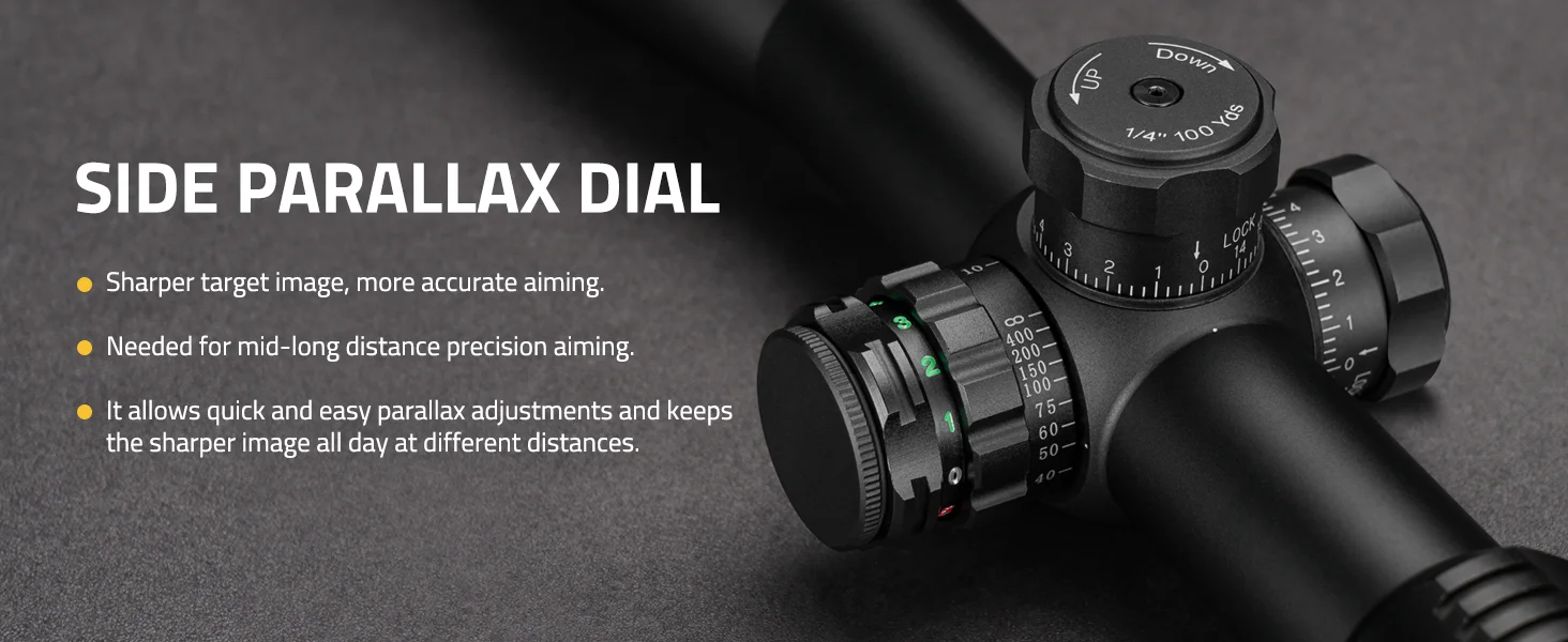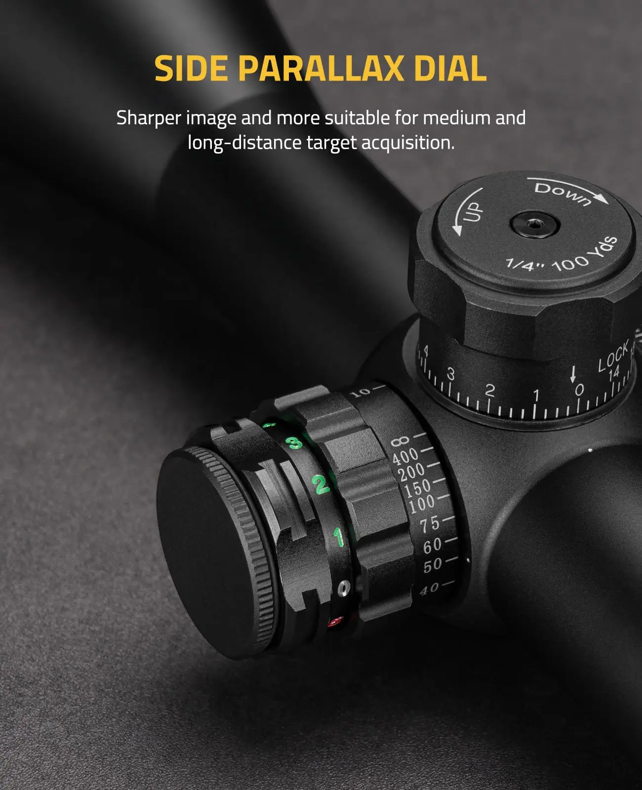 Dial de enfoque de paralaje lateral: el dial de enfoque de paralaje lateral proporciona a los usuarios Enfoque de imagen y eliminación de paralaje, con un rango de ajuste de hasta 20 yardas y hasta 400 yardas, lo que le permite obtener imágenes más nítidas a distancias cercanas o medias.