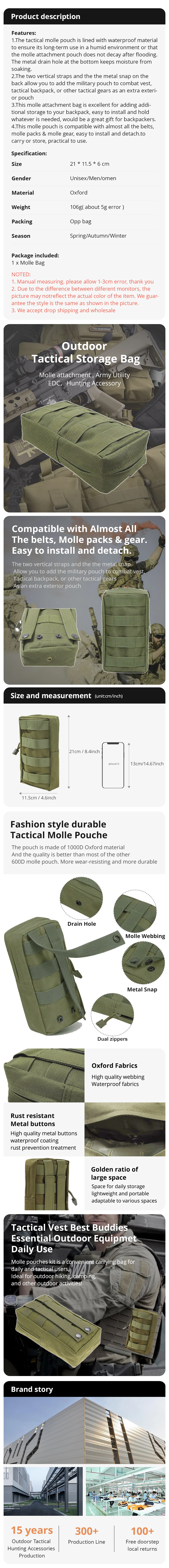 • Diseño táctico Molle :El diseño Molle permite una fácil adhesión a mochilas y chalecos tácticos, maximizando la funcionalidad y la eficiencia.