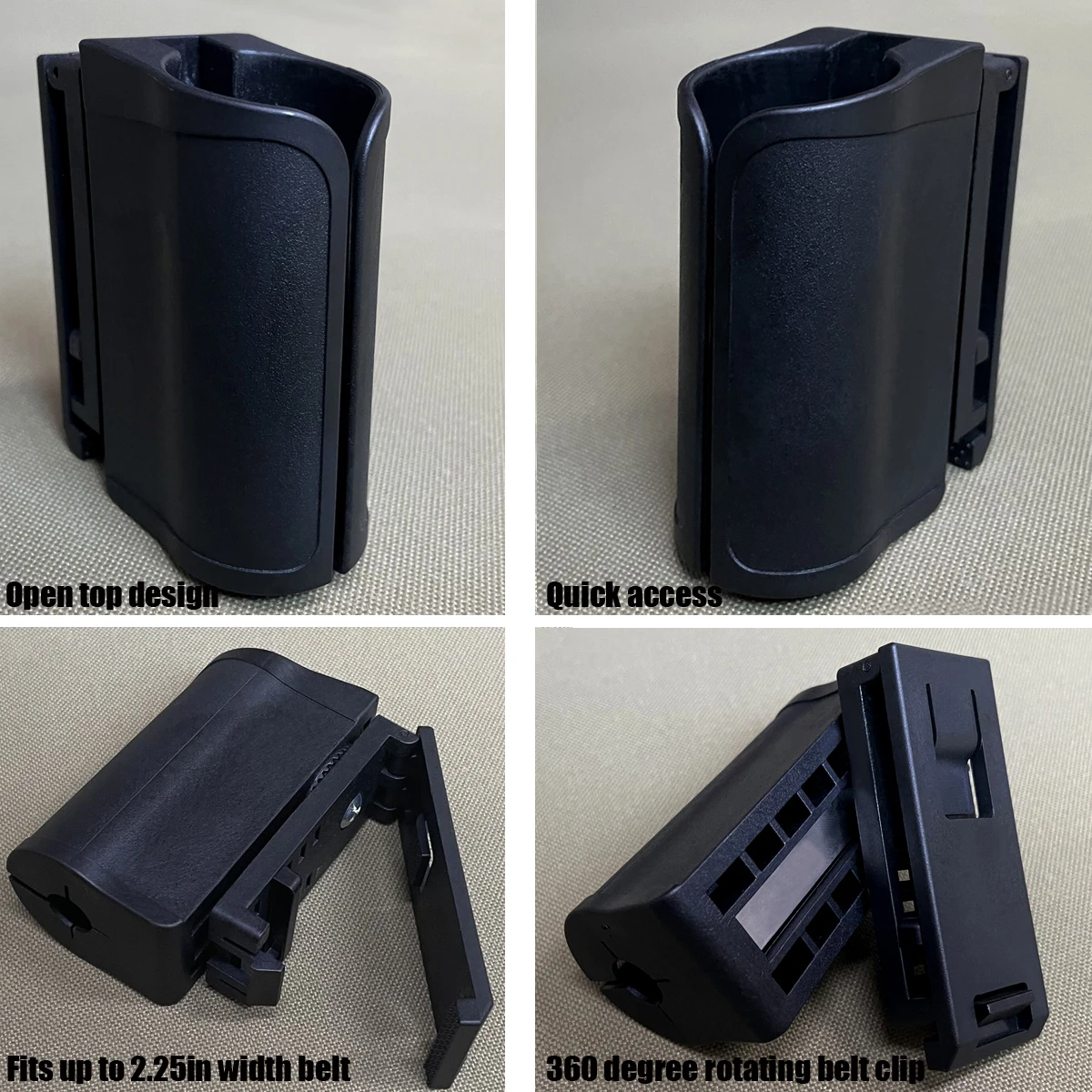 Sujeta de forma segura el spray de pimienta OC para usos en un cinturón de servicio o regular. Clip de cinturón giratorio de 360 grados.