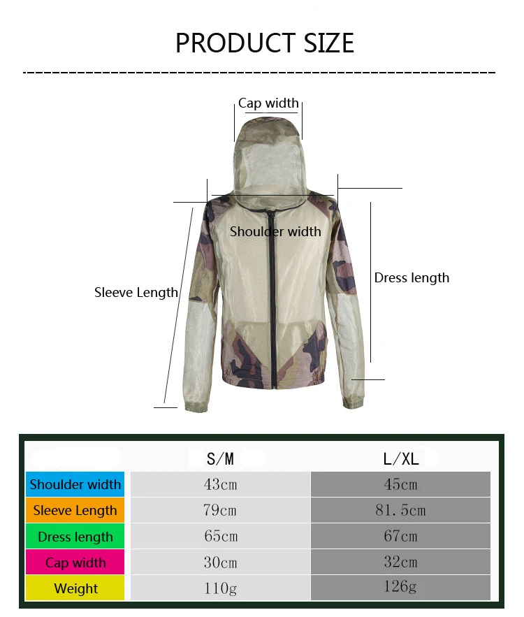 Chaqueta antimosquitos (incluye casco)/pantalones antimosquitos/pies antimosquitos/guantes antimosquitos. Un artículo se embala en una bolsa de OPP separada. Todo el conjunto está embalado en una bolsa con cordón.
