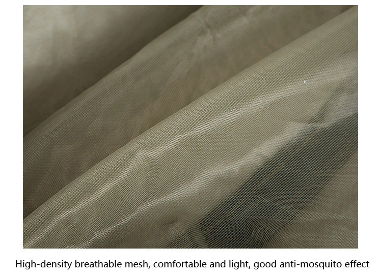 1. El producto es un sistema de protección contra mosquitos hecho de malla de alta densidad, adecuado para cualquier uso deportivo al aire libre, equipo ligero, pequeño volumen de almacenamiento, malla pequeña puede bloquear todo tipo de micro insectos.