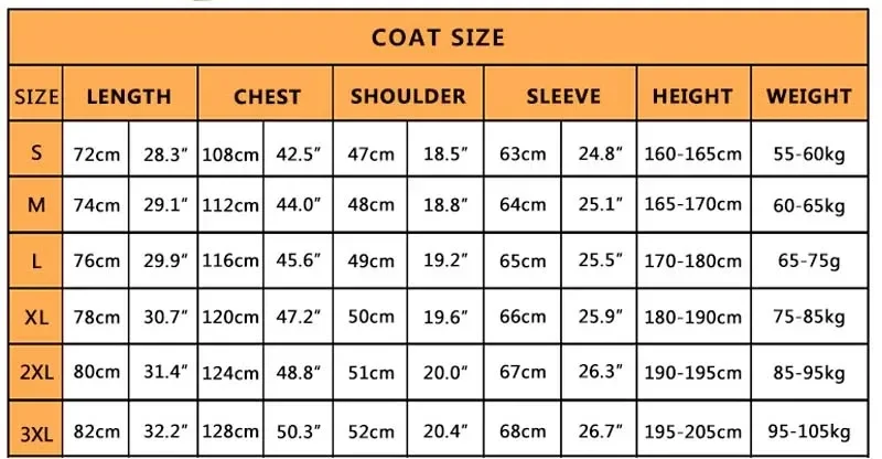 Tamaño:De acuerdo con la tabla de tallas, elija una adecuada para su chaqueta, tolerancia de error de 1-2 cm, si no está seguro del tamaño, envíe información para indicarme su altura, peso, hombro y pecho, lo ayudaré a elegir el tamaño correcto, ¡gracias!