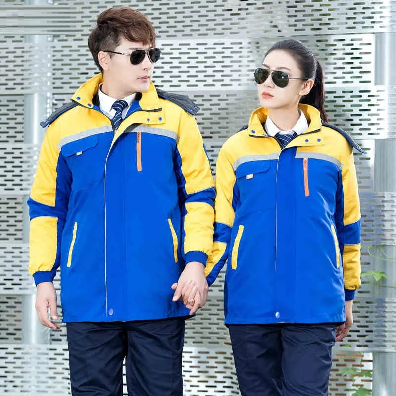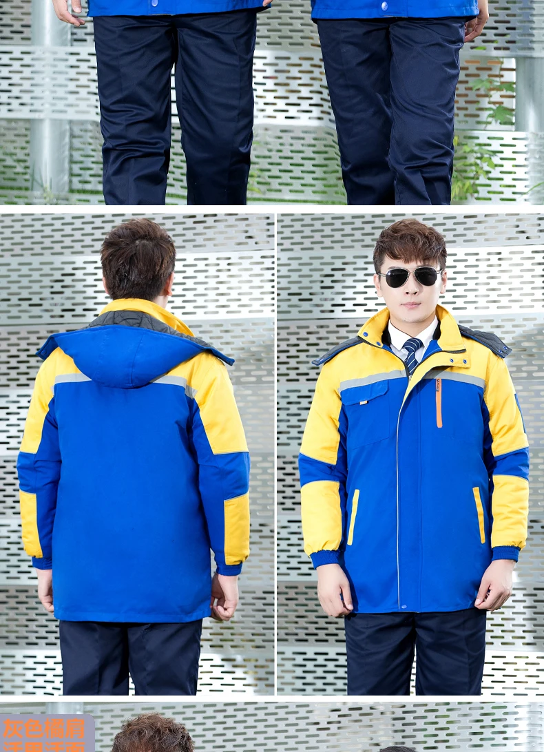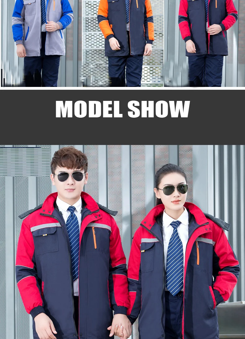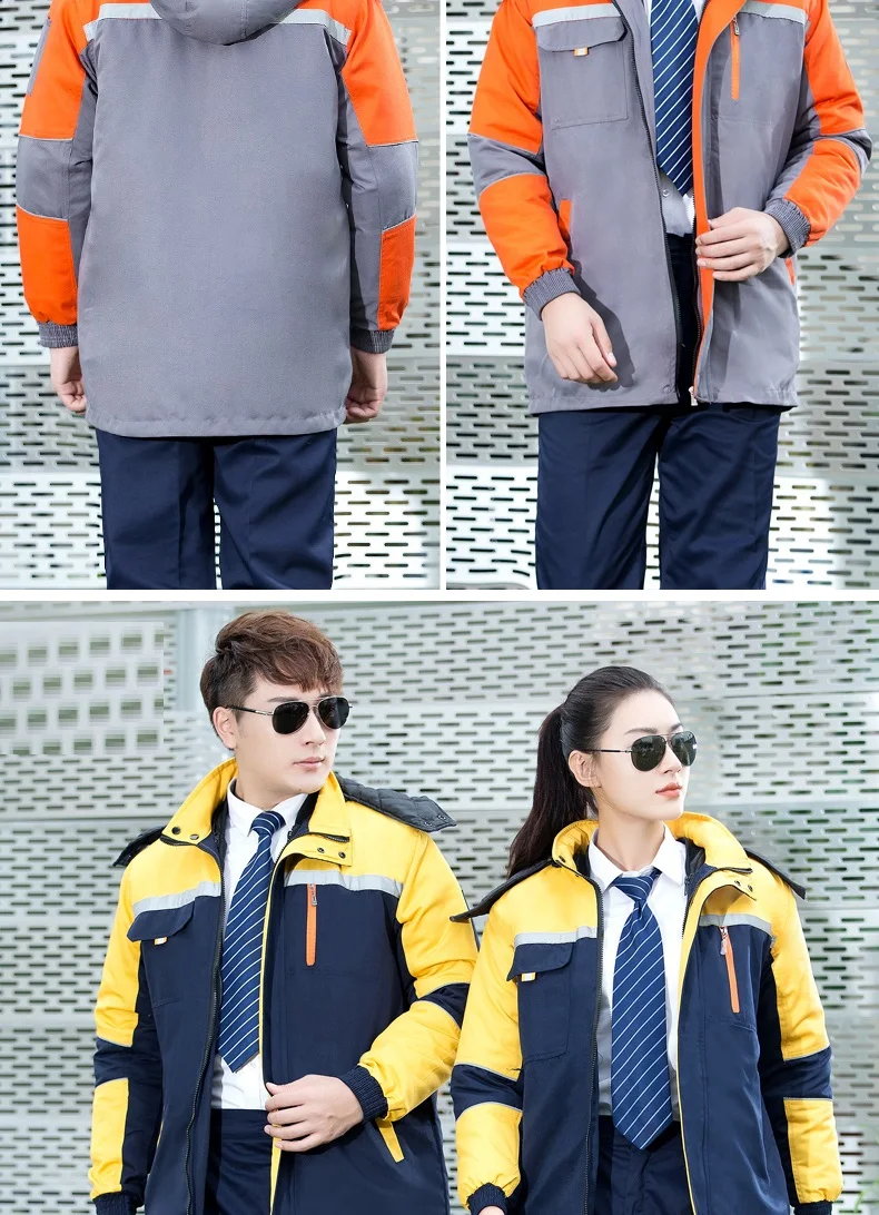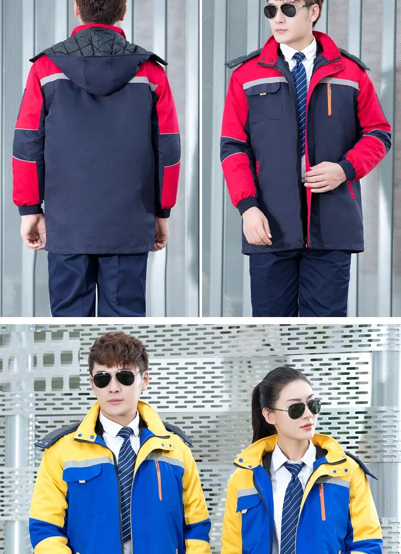 Mono de talla grande para hombre y mujer, ropa protectora gruesa, chaqueta, reparación de automóviles, herramientas personalizadas, ropa de invierno, chaqueta, abrigo vivoRopa de trabajo de talla grande para hombre y mujer, chaqueta gruesa cálida, abrigo para reparación de automóviles, taller mecánico, abrigo con capucha de color de contraste de invierno