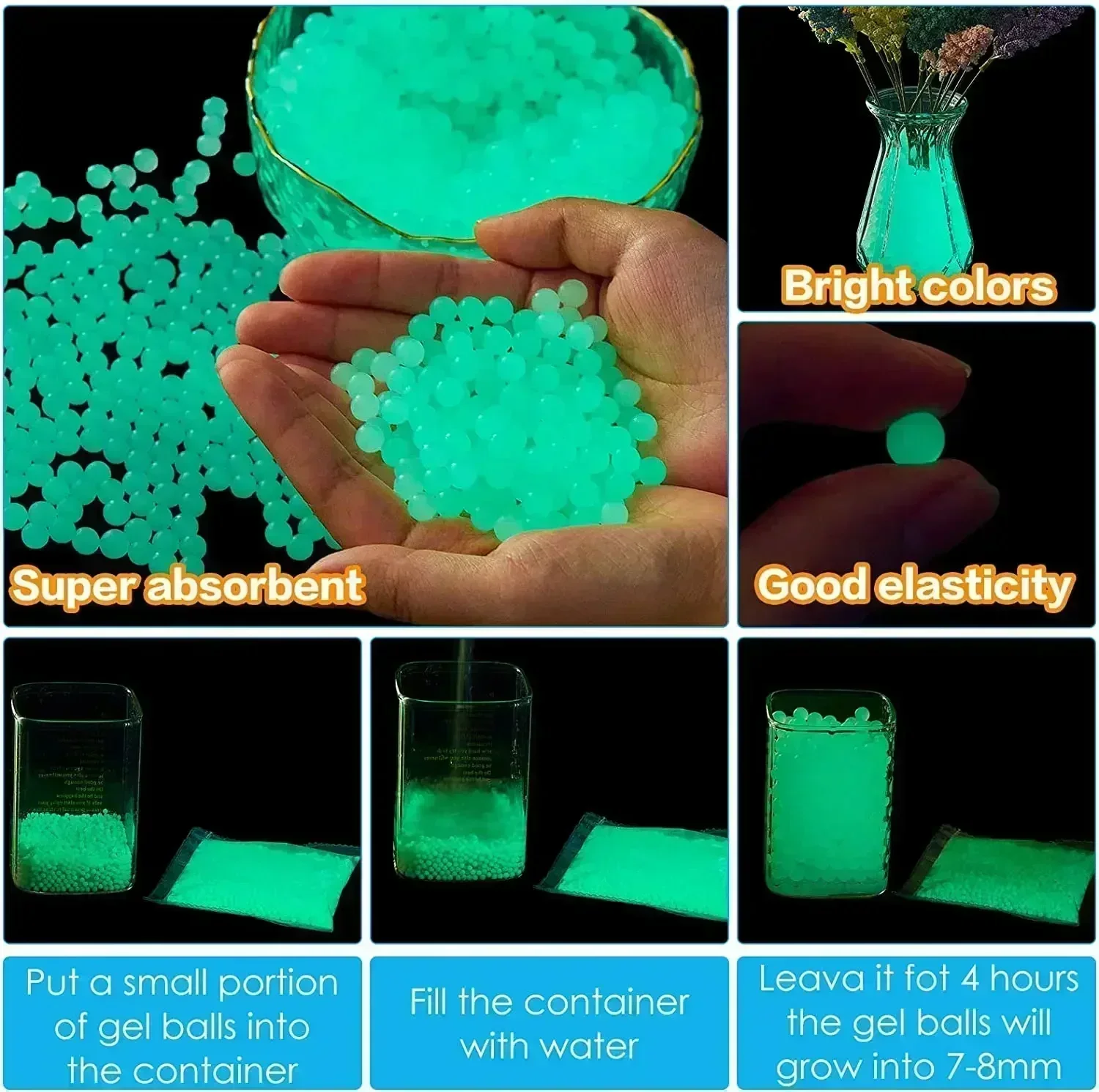 3. 【Fácil de usar】 El paquete es pequeño, por lo que puedes llevar la bola salpicadora a donde quieras. Remoje la bola de gel en agua durante 5 horas antes de usarla, se expandirán hasta 7-8 mm.