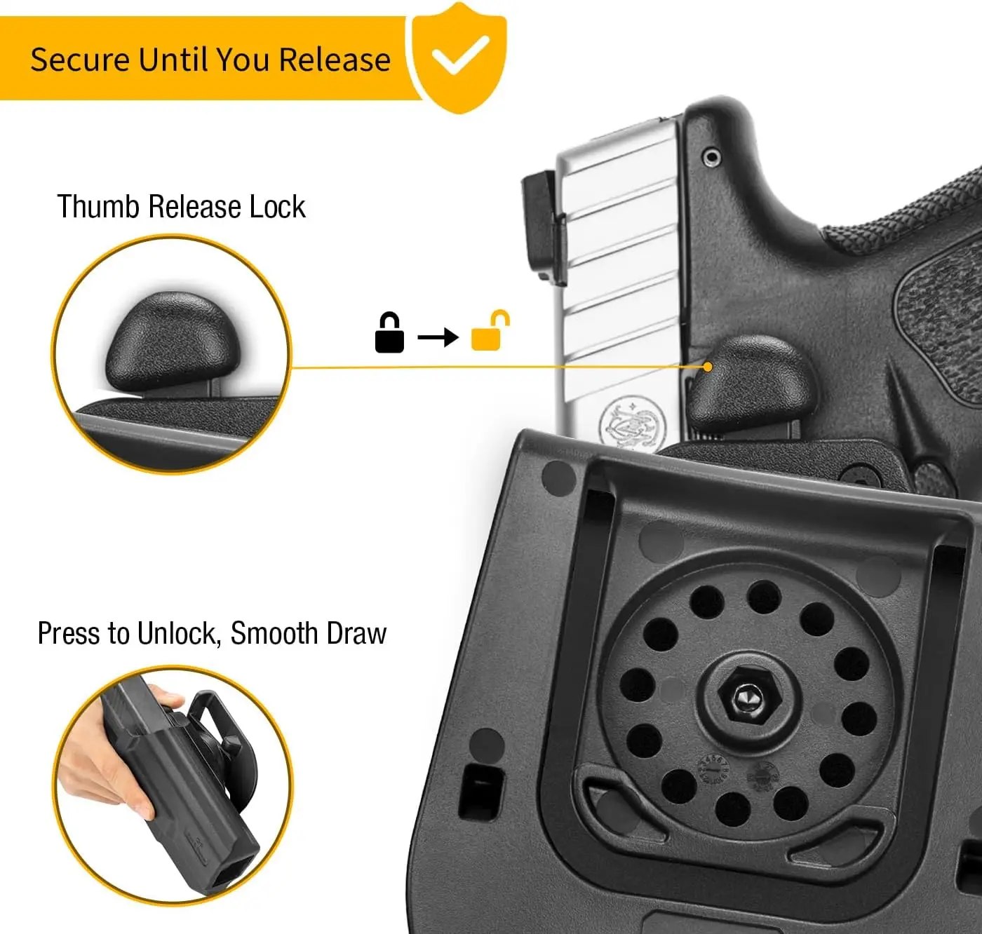 【Clic seguro e interior sin rayones】 El clic nítido confirma el bloqueo.Los bordes pulidos a mano y el interior liso protegen su arma de fuego durante el uso.