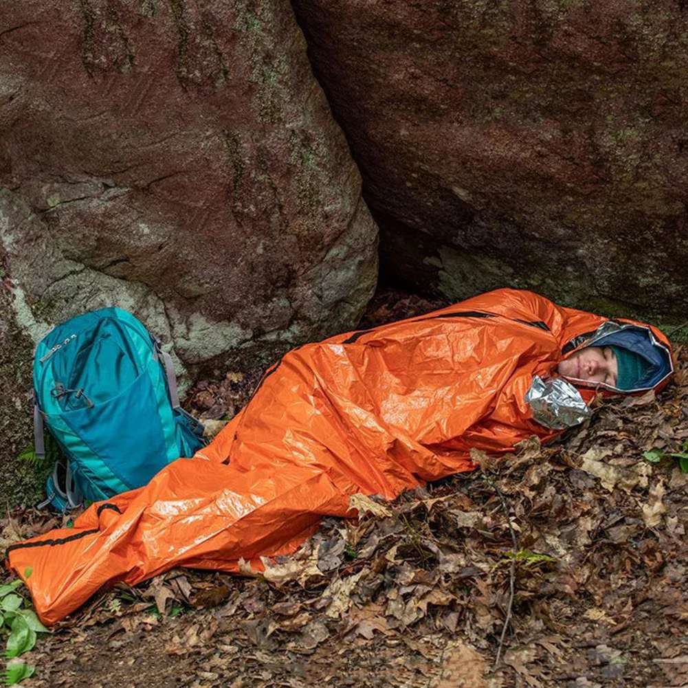 Saco de dormir térmico de emergencia impermeable, saco bivy portátil, manta de supervivencia, bolsas a prueba de viento para acampar, senderismo al aire libreCaracterística:1.Material reflectante de emergencia:El saco de dormir de emergencia estilo sobre para exteriores y la manta multifuncional de primeros auxilios de papel de aluminio PE se pueden utilizar como dispositivo de señalización con su superficie reflectante para ayudar a los rescatistas a localizarlo rápidamente.