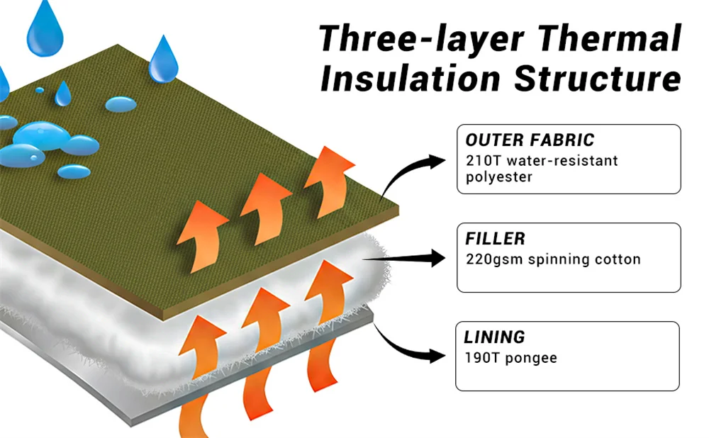 ✔Capa exterior: poliéster impreso 210T con revestimiento de poliuretano de 50 mm para resistencia a la humedad y al viento.