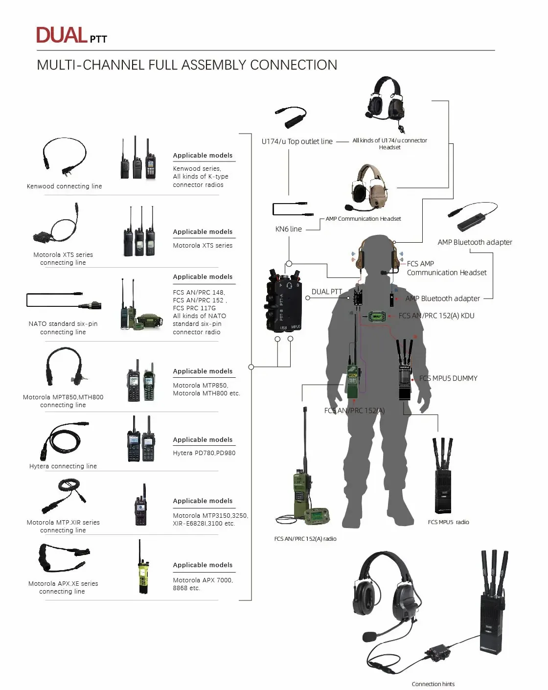 Salida superior de Radio PTT, salida inferior V20 V60, canales de comunicación duales KN6, interfaces de Cable, adaptadores de cabezal