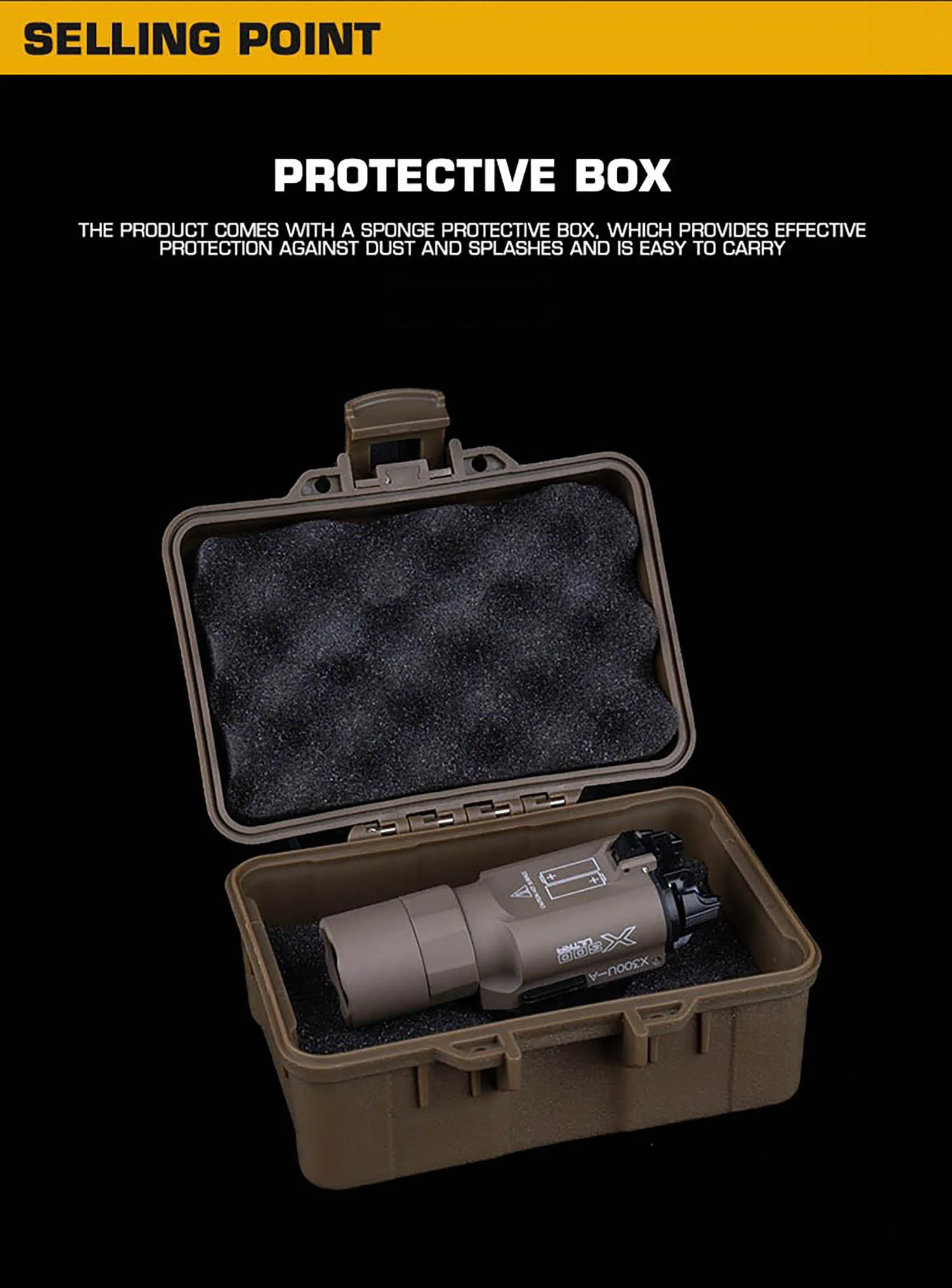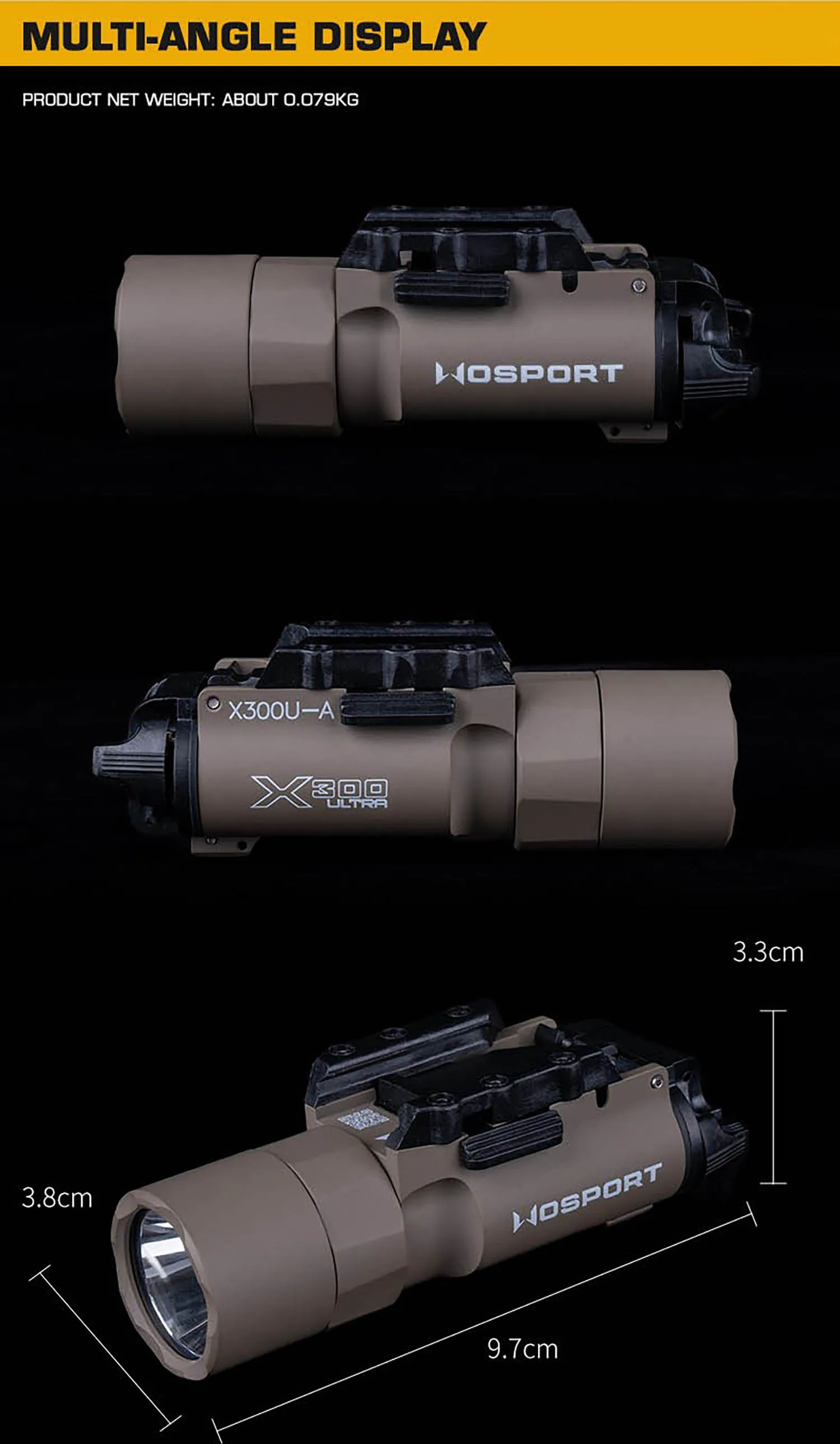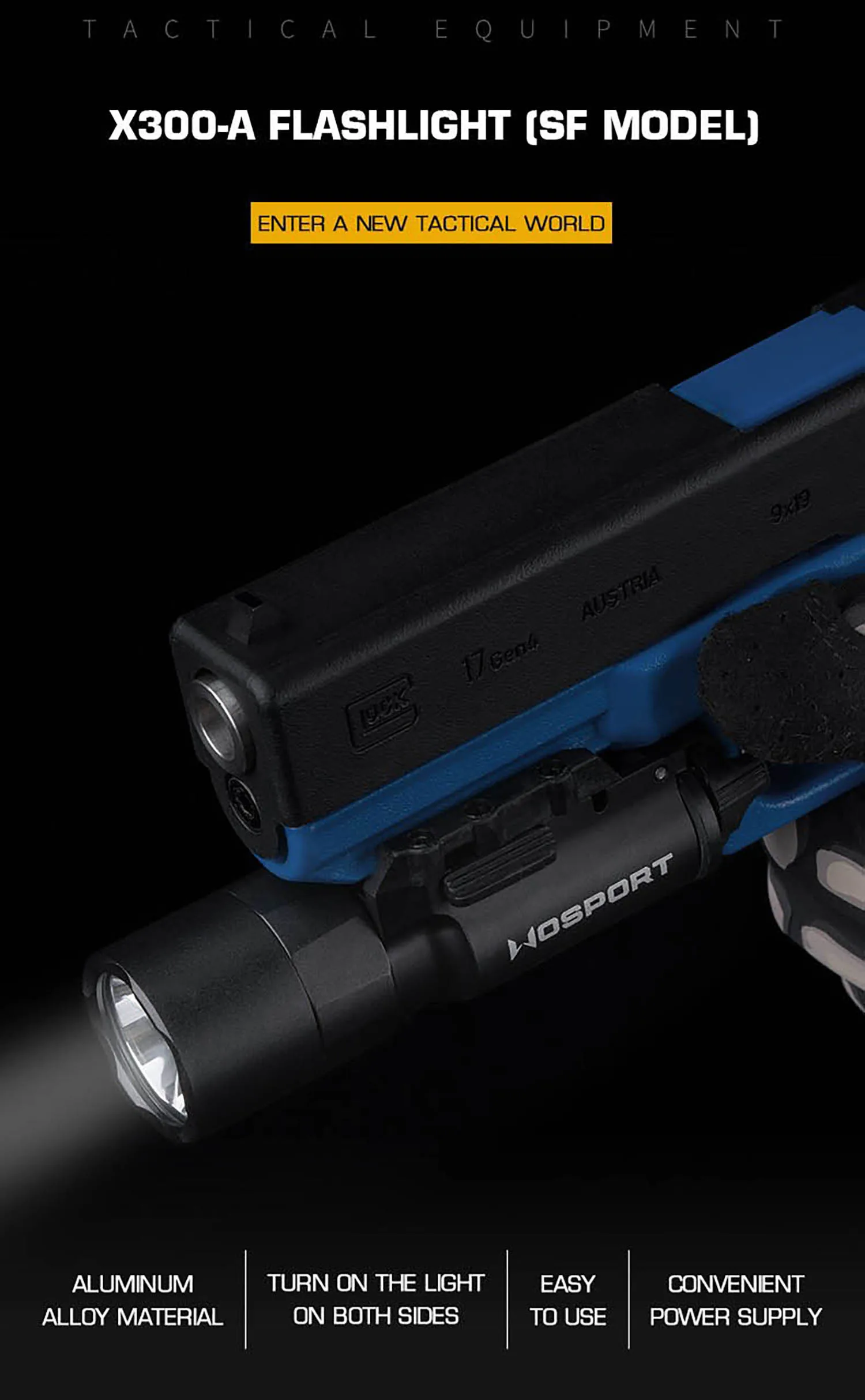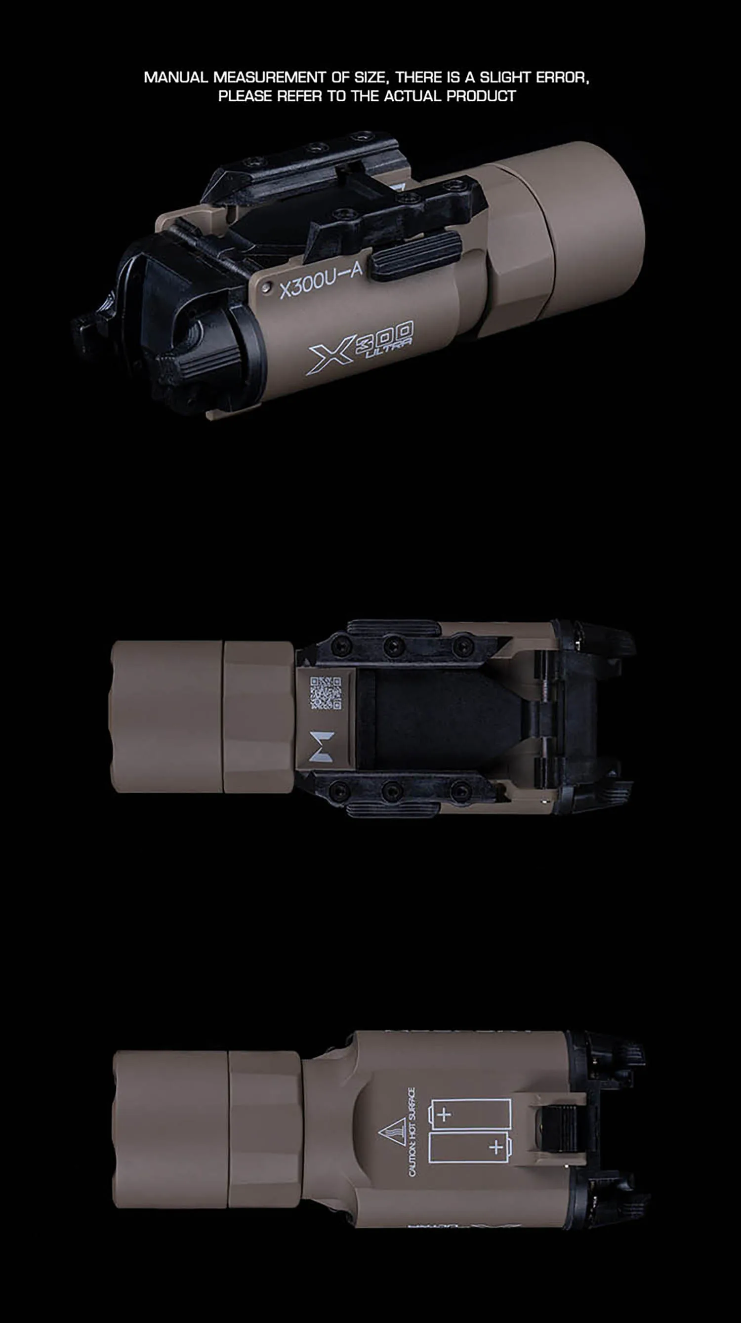 Nombre del producto: Linterna X300-A (modelo SF) Número de artículo.:FL-05 Embalaje del producto: caja empaquetada Tamaño del producto: 13,5*9,5*7,5 cm Peso neto del producto: 0,079 KG Peso bruto del producto: 0,22 KG Color del producto: negro/tan Material principal: aleación de aluminio. Viene con caja protectora Luz de 800 limones Puede encender la luz en ambos lados Puede montar la luz en la pistola o el casco. Alimentado por 2 pilas 123a (no incluidas)