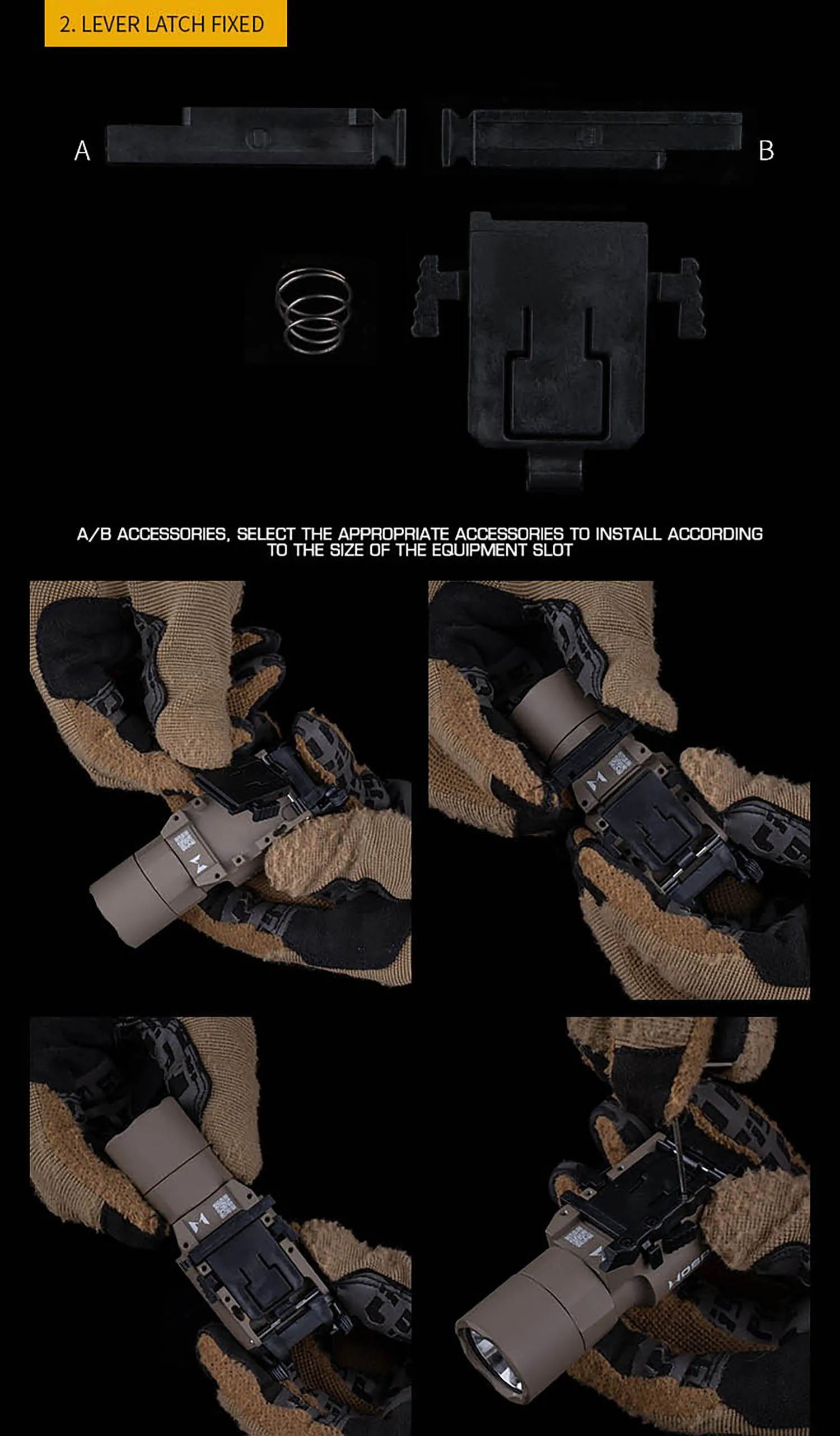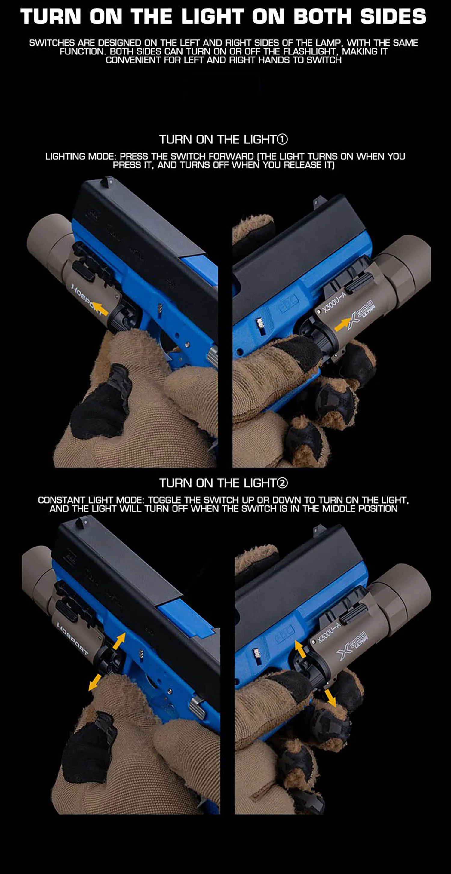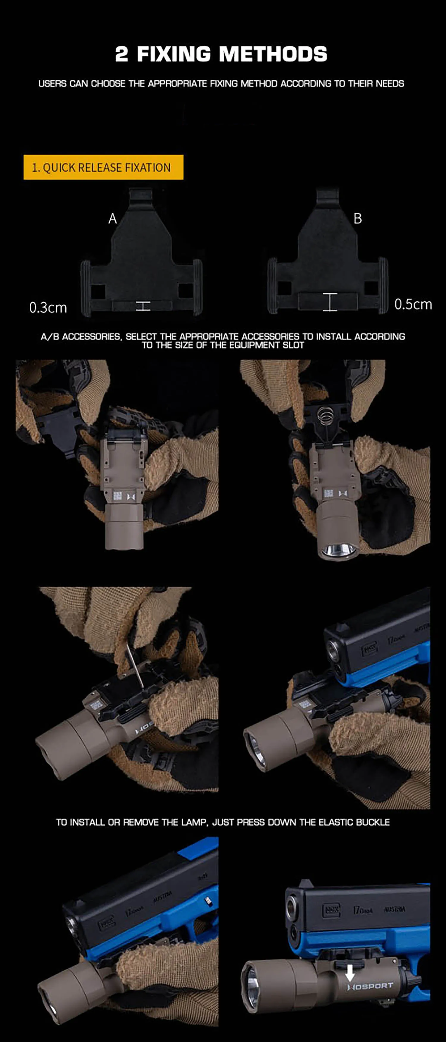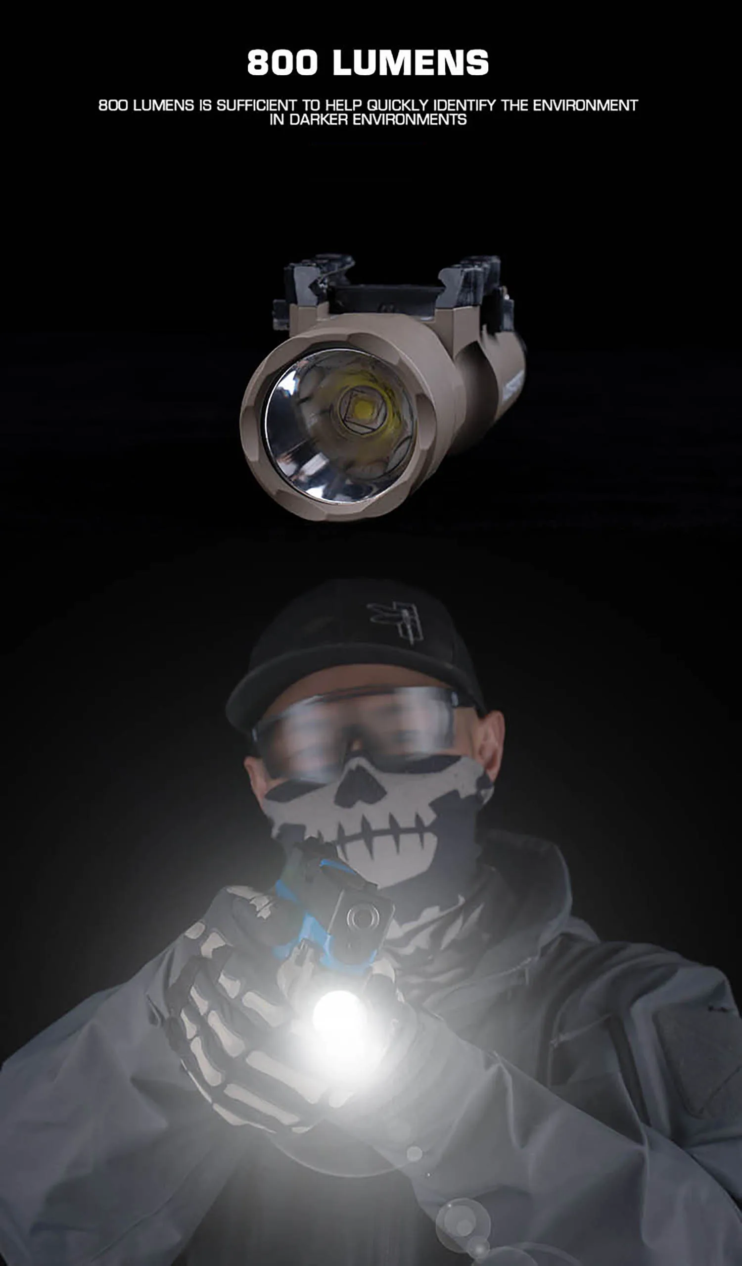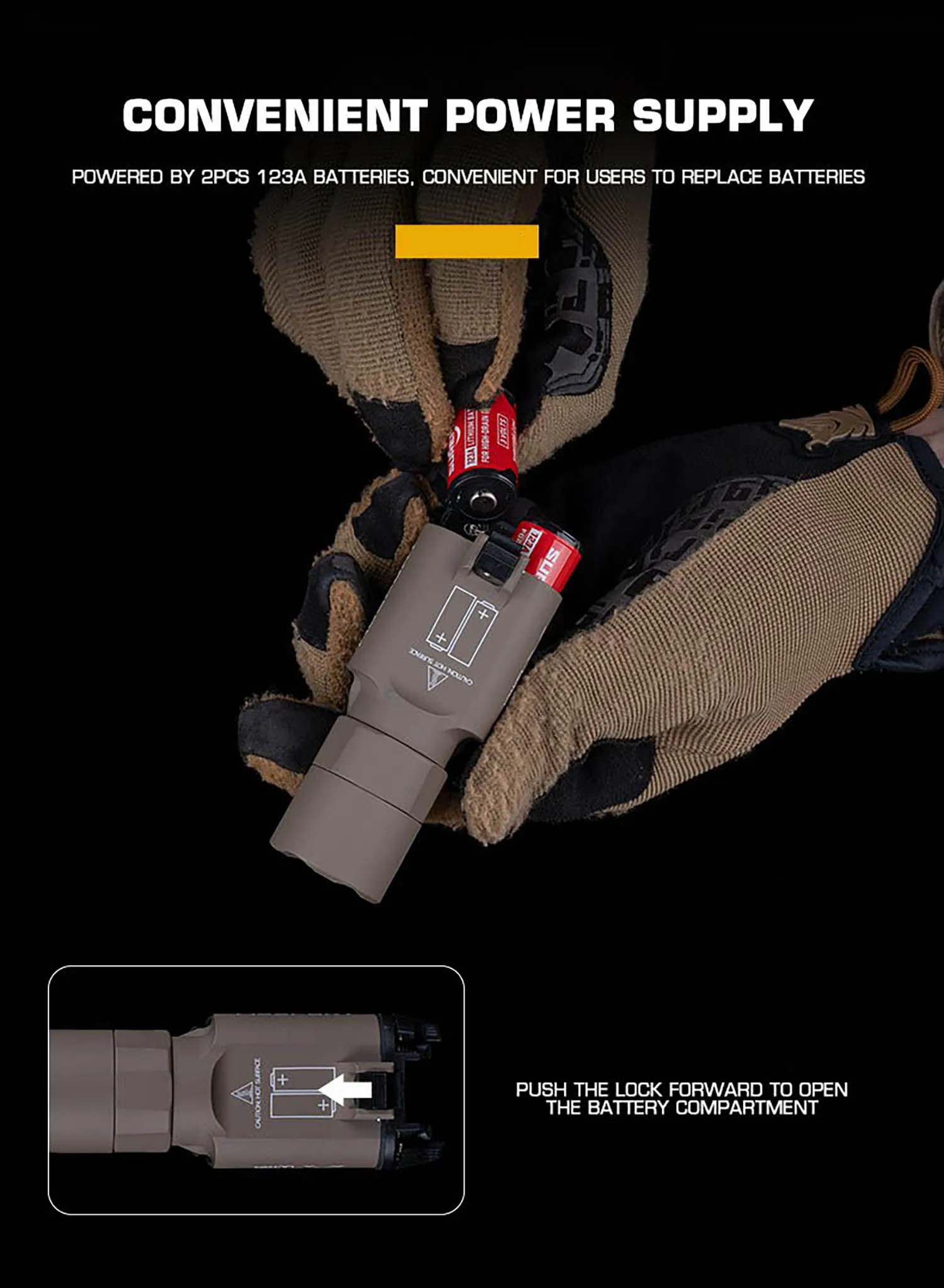 Nombre del producto: Linterna X300-A (modelo SF) Número de artículo.:FL-05 Embalaje del producto: caja empaquetada Tamaño del producto: 13,5*9,5*7,5 cm Peso neto del producto: 0,079 KG Peso bruto del producto: 0,22 KG Color del producto: negro/tan Material principal: aleación de aluminio. Viene con caja protectora Luz de 800 limones Puede encender la luz en ambos lados Puede montar la luz en la pistola o el casco. Alimentado por 2 pilas 123a (no incluidas)