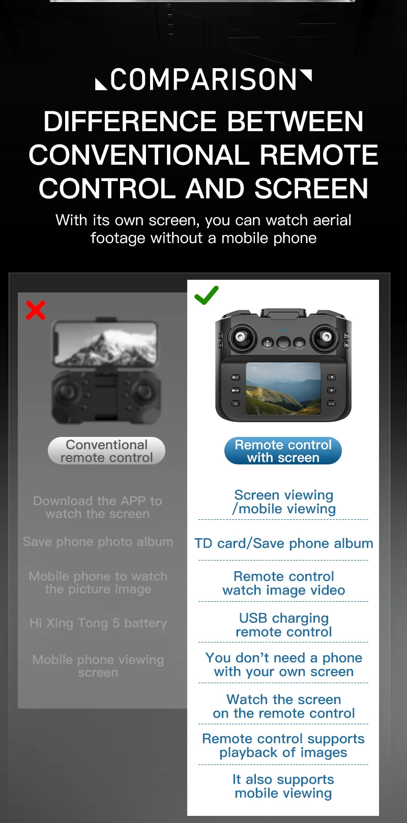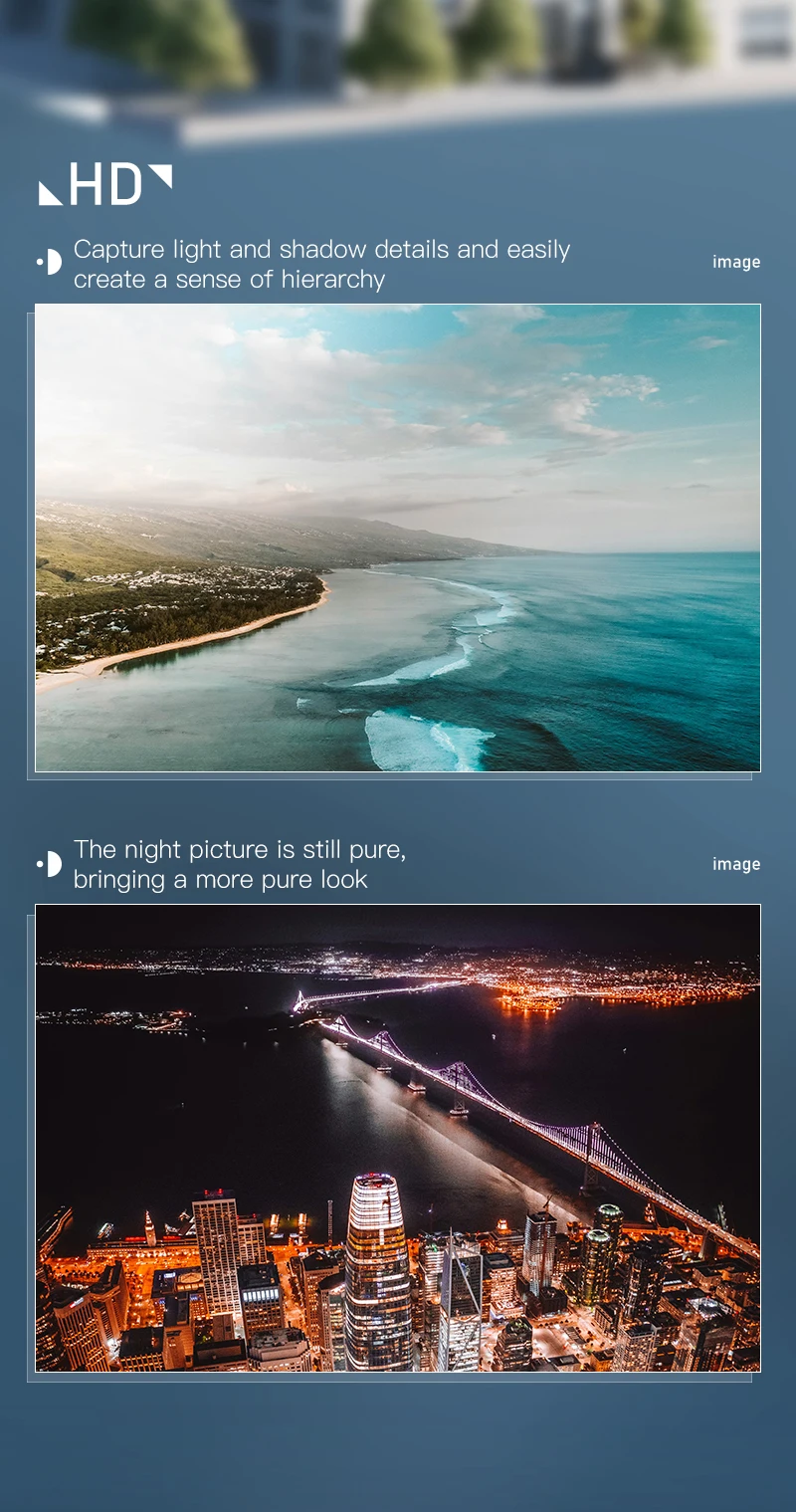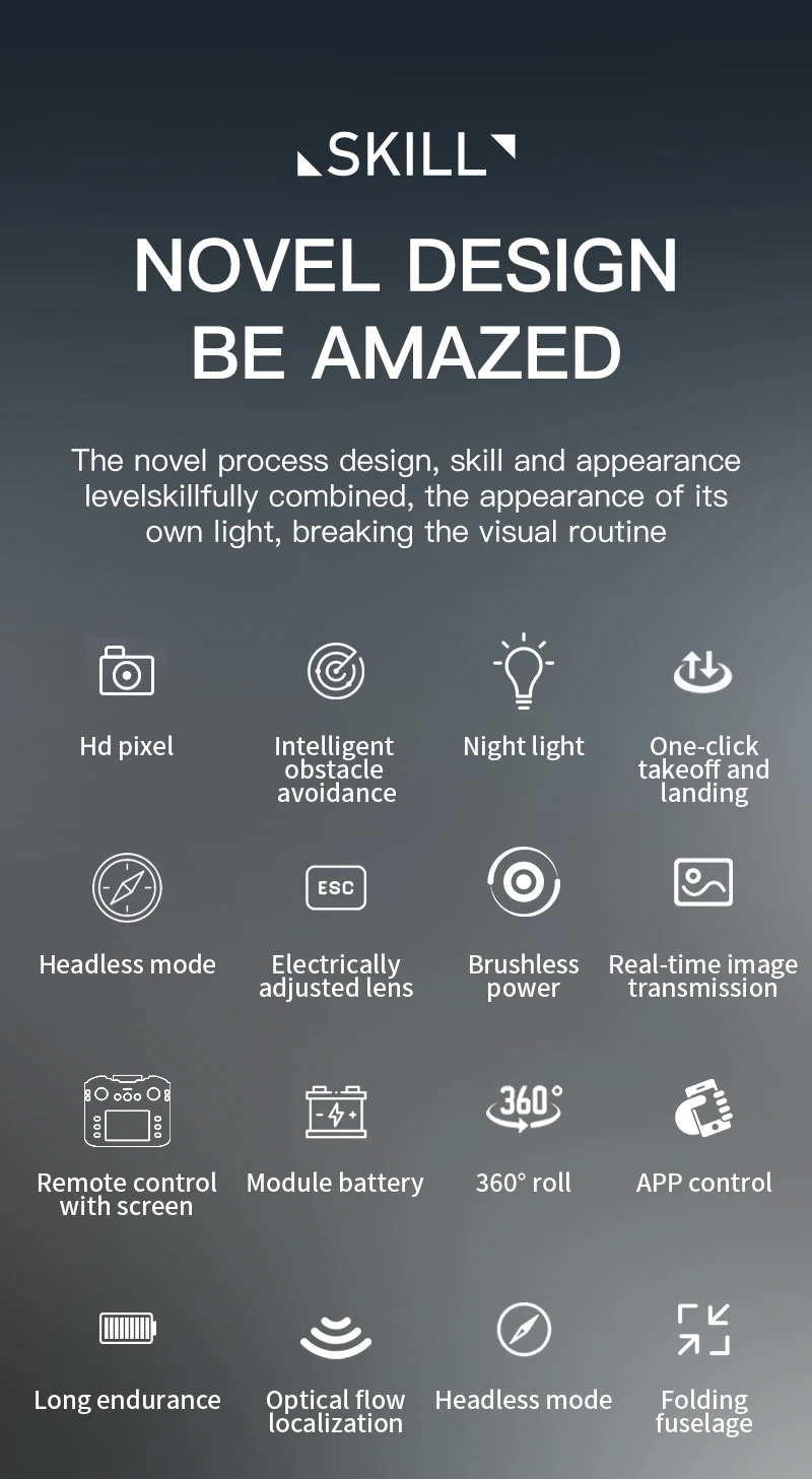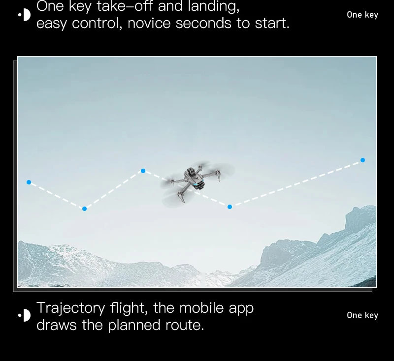 Motor sin escobillas, cámara ESC, arriba y abajo, giro a la izquierda y a la derecha, avance, retroceso, vuelo lateral izquierdo y derecho, control de velocidad rápida y lenta, modo sin cabeza, flujo óptico de altura fija y punto fijo, fotografía de gestos, grabación de vídeo de gestos, un botón atrás. Cambio de cámara dual