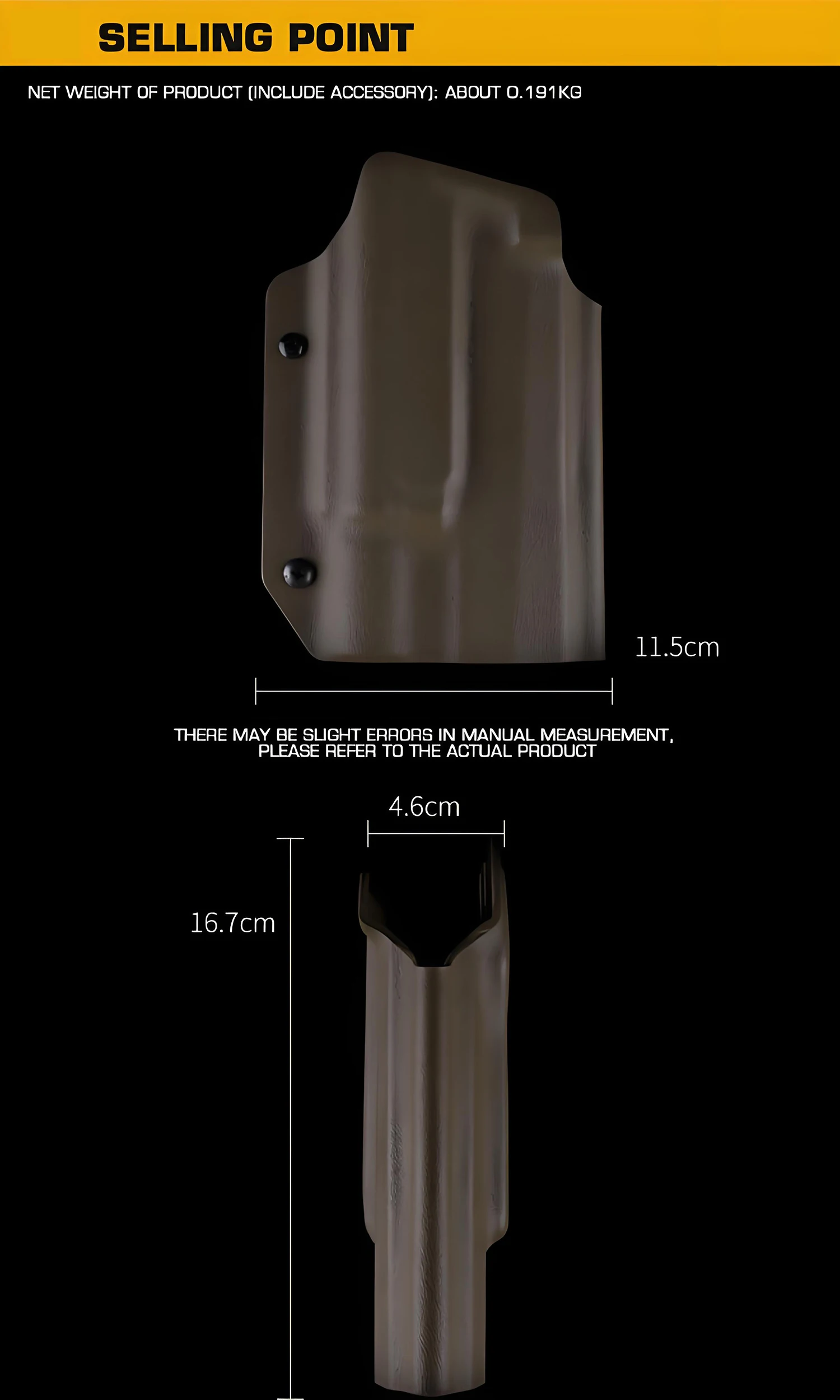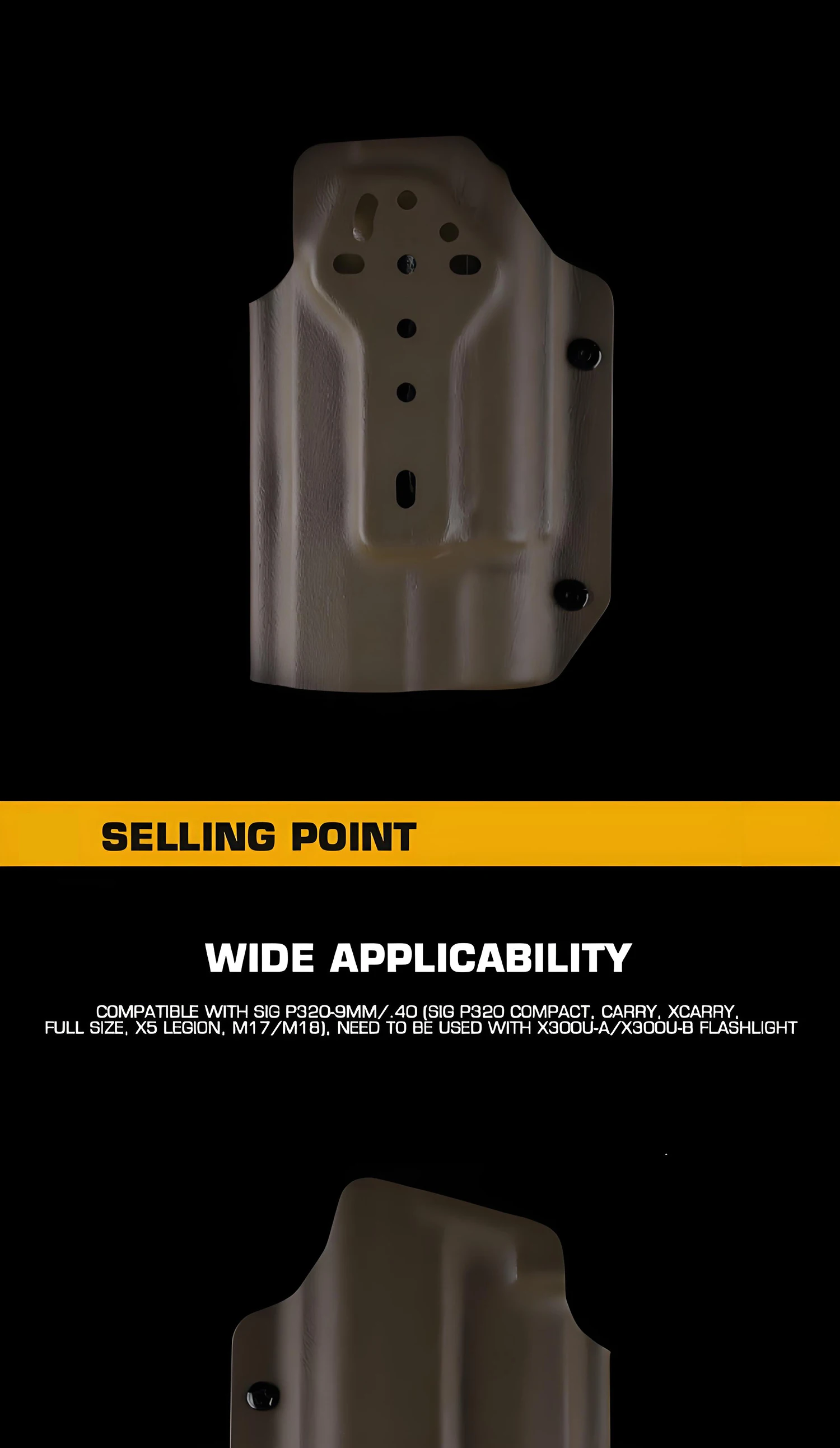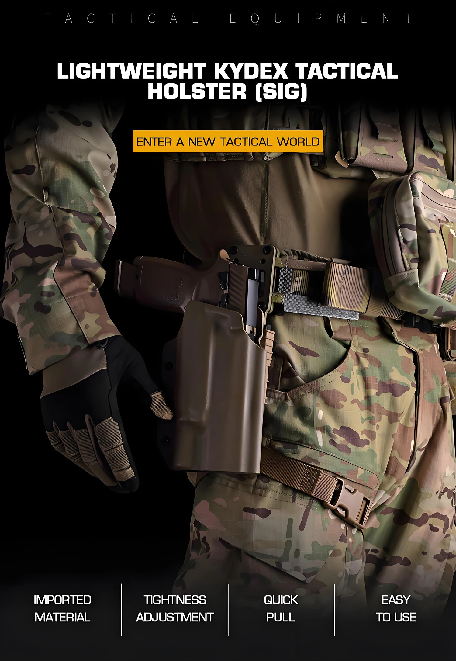 Funda Kydex de calidad profesional diseñada para la serie SIG P320 (9 mm/.40) con compatibilidad con linterna X300U-A/B.Con un peso de sólo 0,191 kg, esta funda moldeada con precisión combina durabilidad Kydex importada con funcionalidad táctica para una rápida implementación en escenarios de combate.