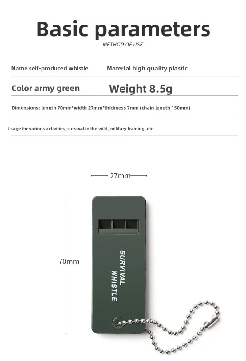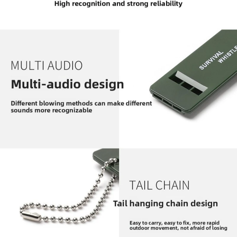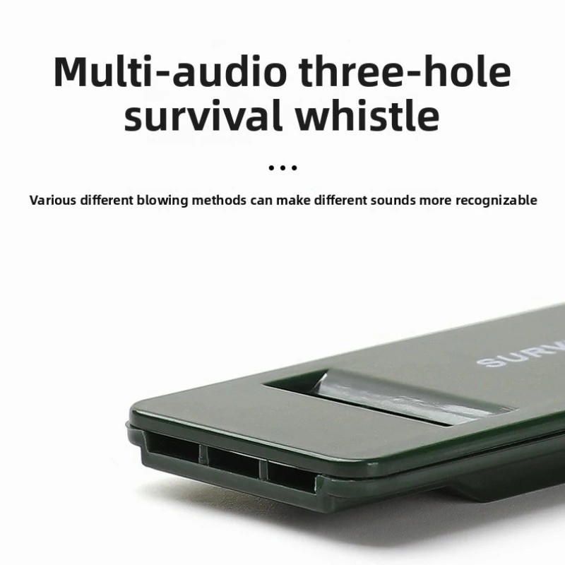 Nombre comercial: Silbato de supervivencia multiaudio Material: plástico de alta calidad Longitud: 70 mm Ancho: 27 mm Espesor: 7 mm Hay tres agujeros, cada uno con un sonido diferente. El sonido es agradable y agradable al combinarlo.