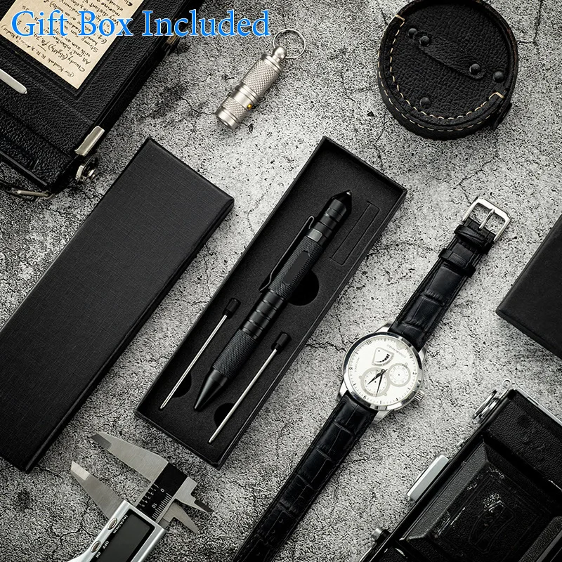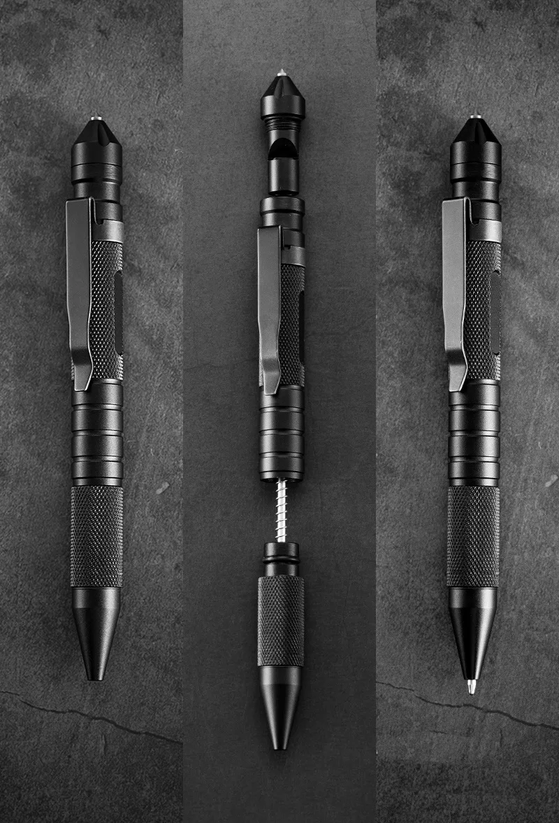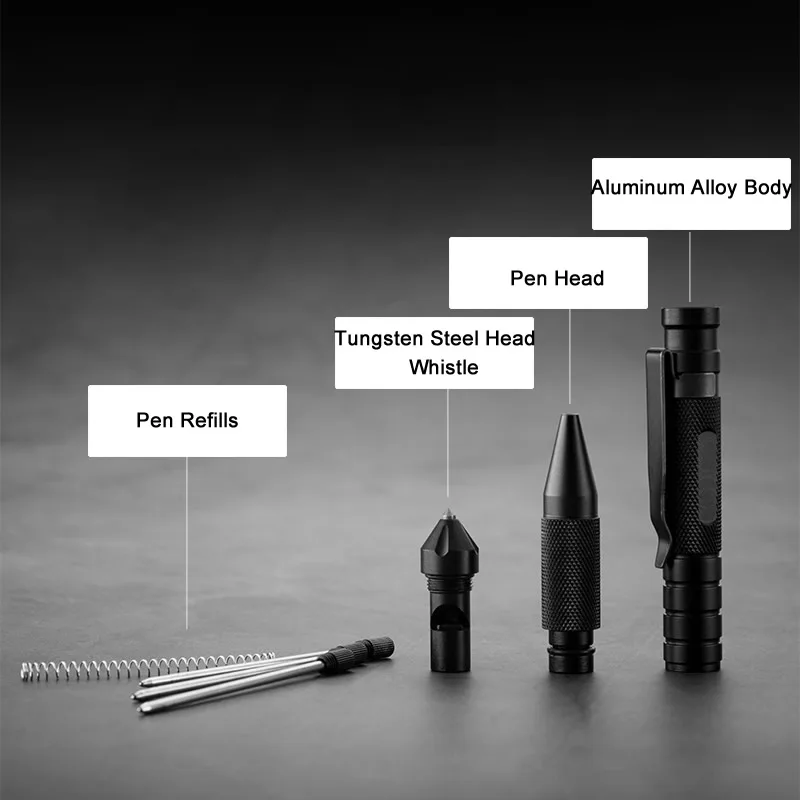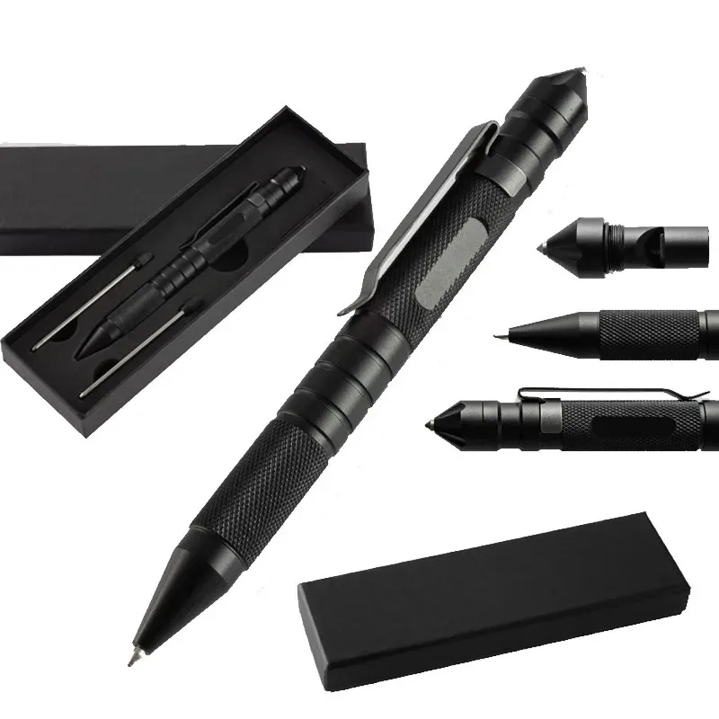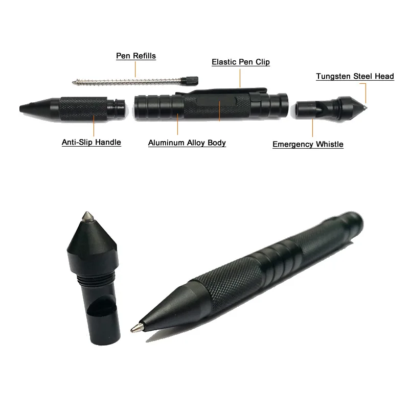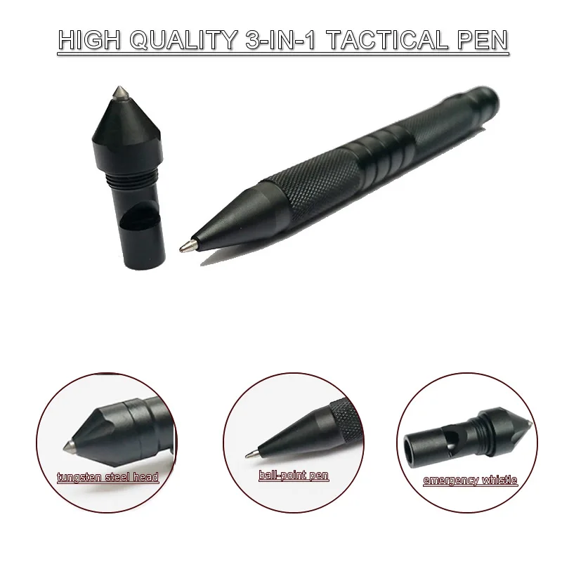 Multifunción: bolígrafo de escritura, cabezal de ataque de acero de tungsteno, silbato de emergencia