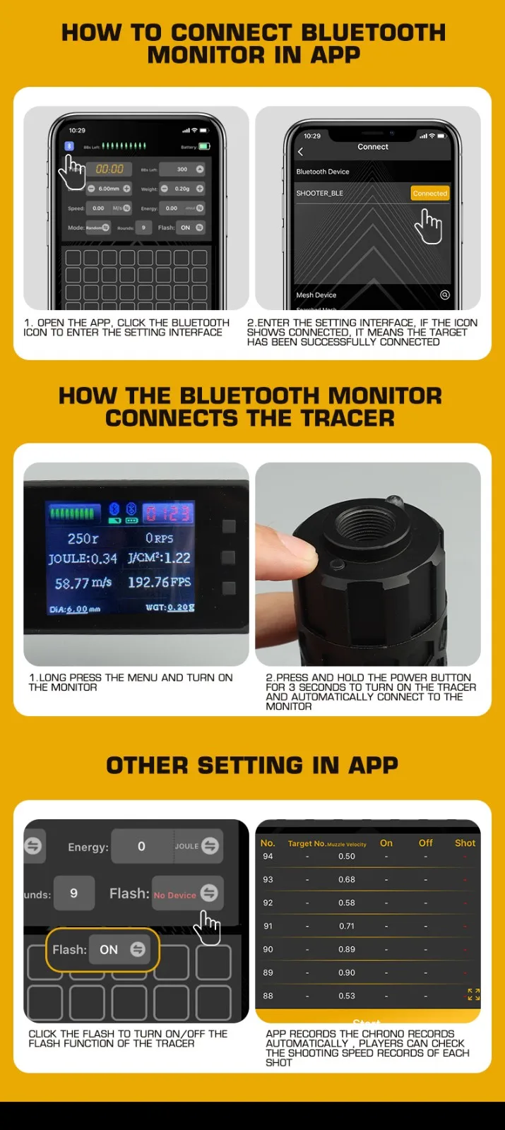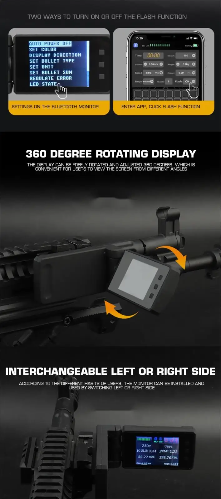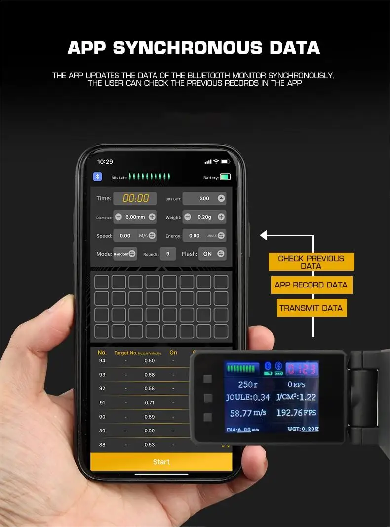 -Monitor externo Bluetooth. Durante el disparo. La pantalla mostrará la velocidad de disparo y la munición restante