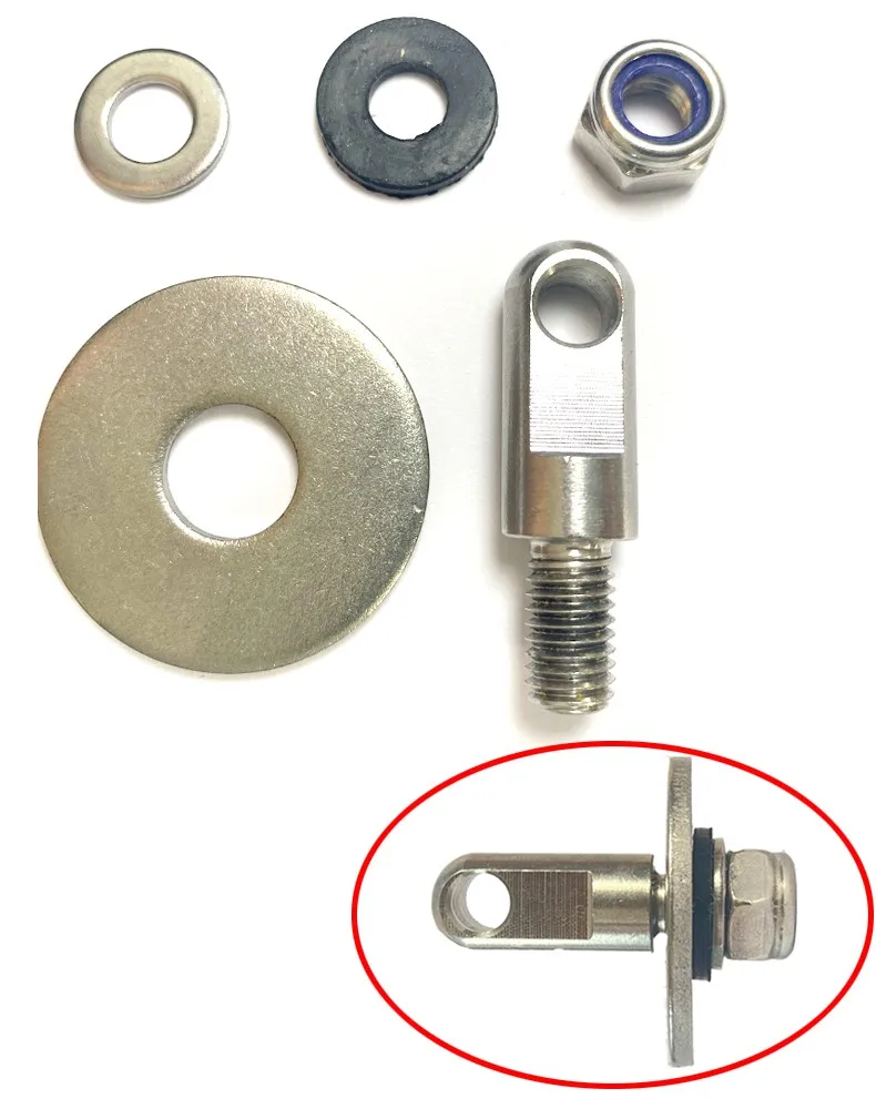 4) En el interior de la lata, coloque la arandela de neopreno sobre las roscas del perno de bloqueo, seguido por la arandela pequeña y luego la contratuerca de nailon.Apriete el conjunto con una llave, teniendo en cuenta que el lado "redondo" del perno de bloqueo puede tener bordes/fresas afilados, por lo que se debe utilizar una herramienta en el lado "redondo", no con las manos desnudas.