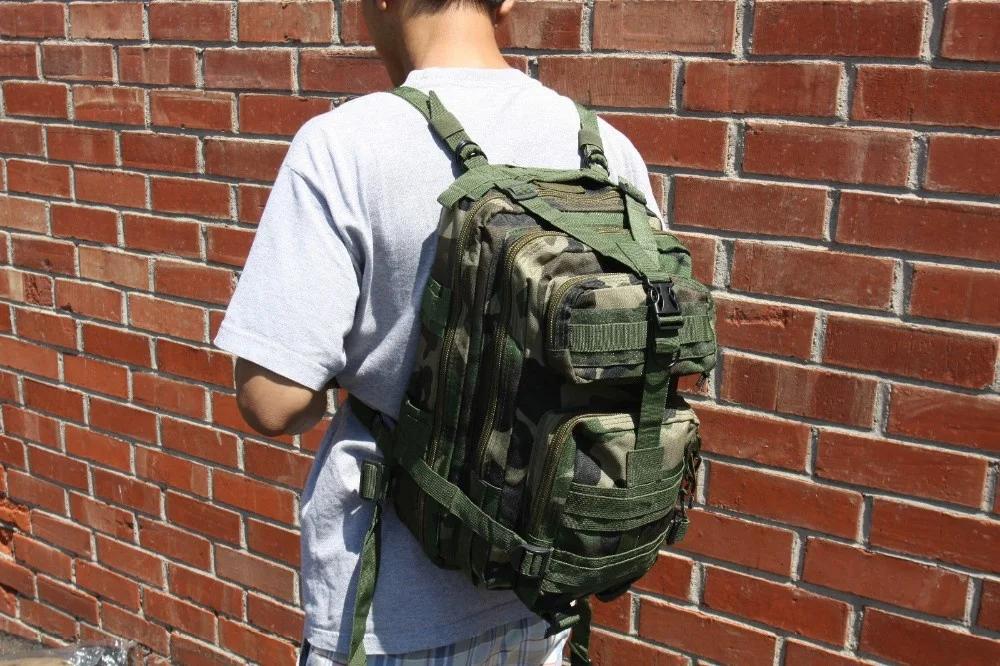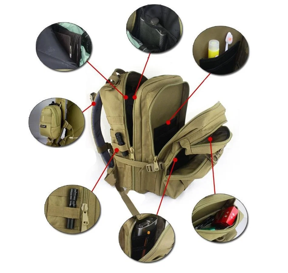 2 Otro grupo de correas hacia arriba y hacia abajo se pueden montar sacos de dormir, tiendas de campaña, chaquetas grandes, cuerdas y otras herramientas portátiles grandes.