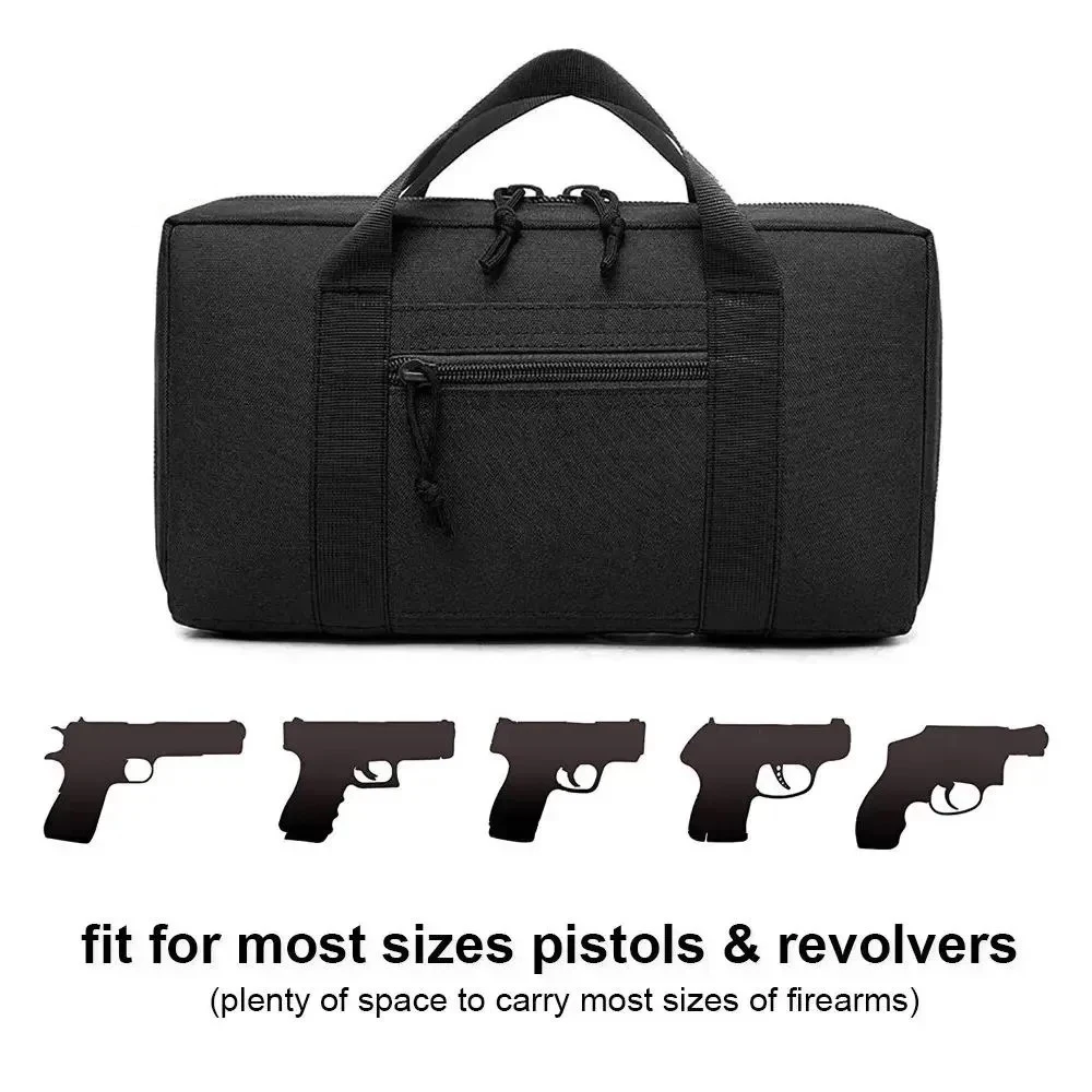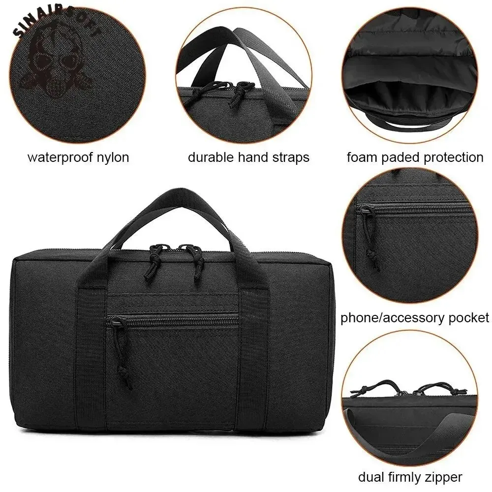 1) Fabricado con material de nailon de alta densidad.2) Con 2 piezas de correa de mano.3) sostener Puede 2 armas, como una pistola.4) Con 7 soportes de correa elástica para linterna, engranajes pequeños, carcasa, revista, etc.5) Un compartimento acolchado de espuma con cierre de cremallera.6) El diseño acolchado de espuma brinda protección completa.Especificaciones:1) Material: nailon 600D duradero2) Peso: 200g3) Color: MC,MCBK,BK,CB,OD,ACU4) Tamaño: 13 "(L) x 7"(H) x 2,75 "(T)(33x18x7CM)5) Se adapta a la mayoría de las pistolas automáticasLista de embalaje