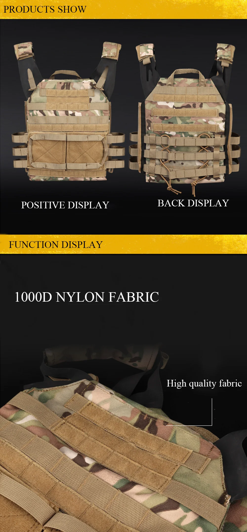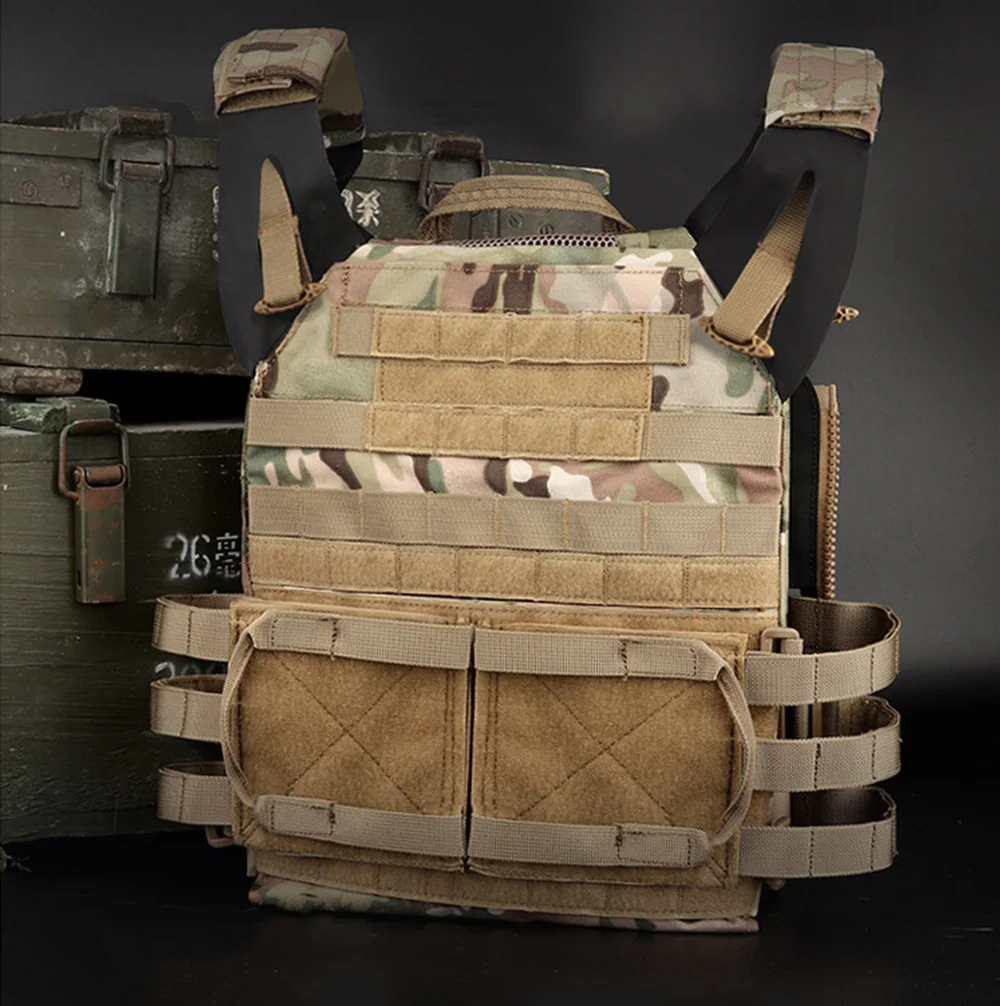 El chaleco parece bastante duradero. No tengo el JPC original para comparar, pero la parte elástica cerca de los hombros me parece un poco dudosa. El chaleco necesita placas y la pieza frontal de sistema MOLLE, así que te recomiendo pedirlas junto con él.