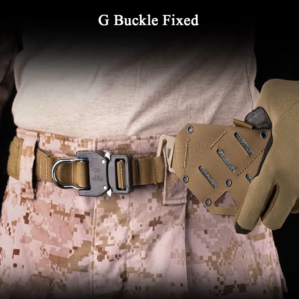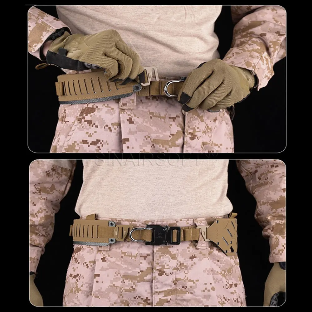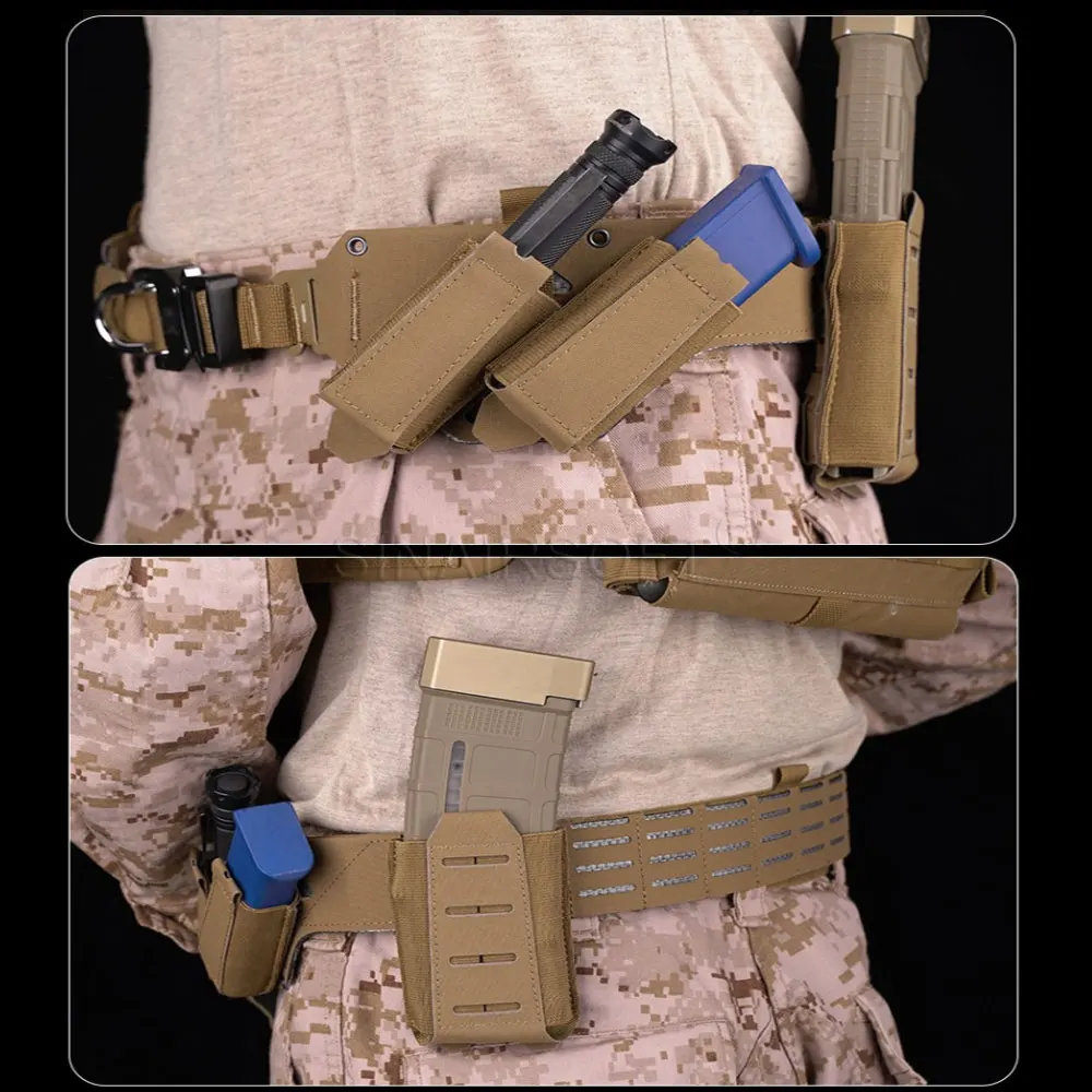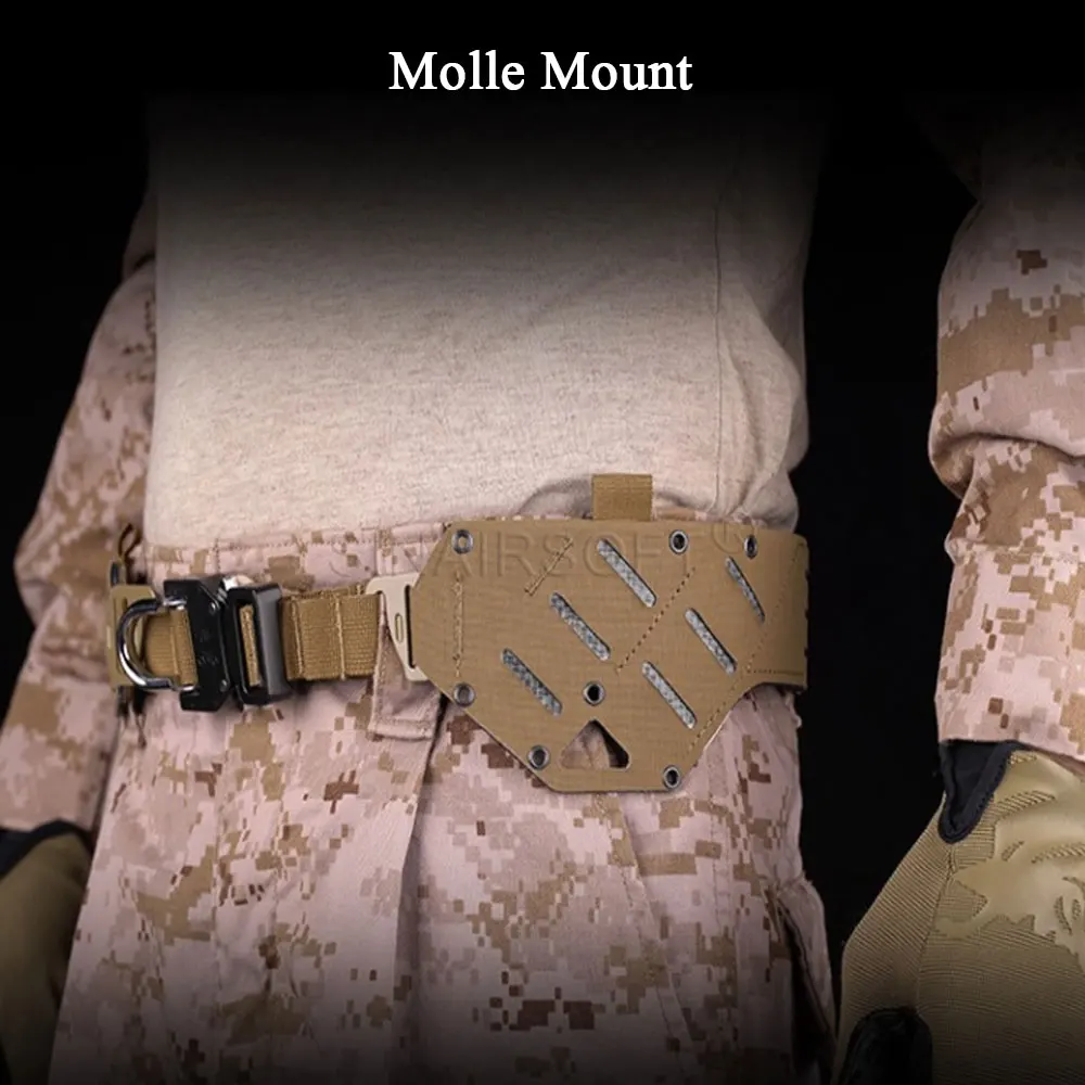 ④Soporte Molle: el lado izquierdo está diseñado con un Molle inclinado, que puede instalar dos cargadores de pistola. La parte posterior del cinturón está diseñada con una ranura Molle de 0,5 pulgadas.Permitiendo a los usuarios instalarlo a diferentes alturas según sea necesario.