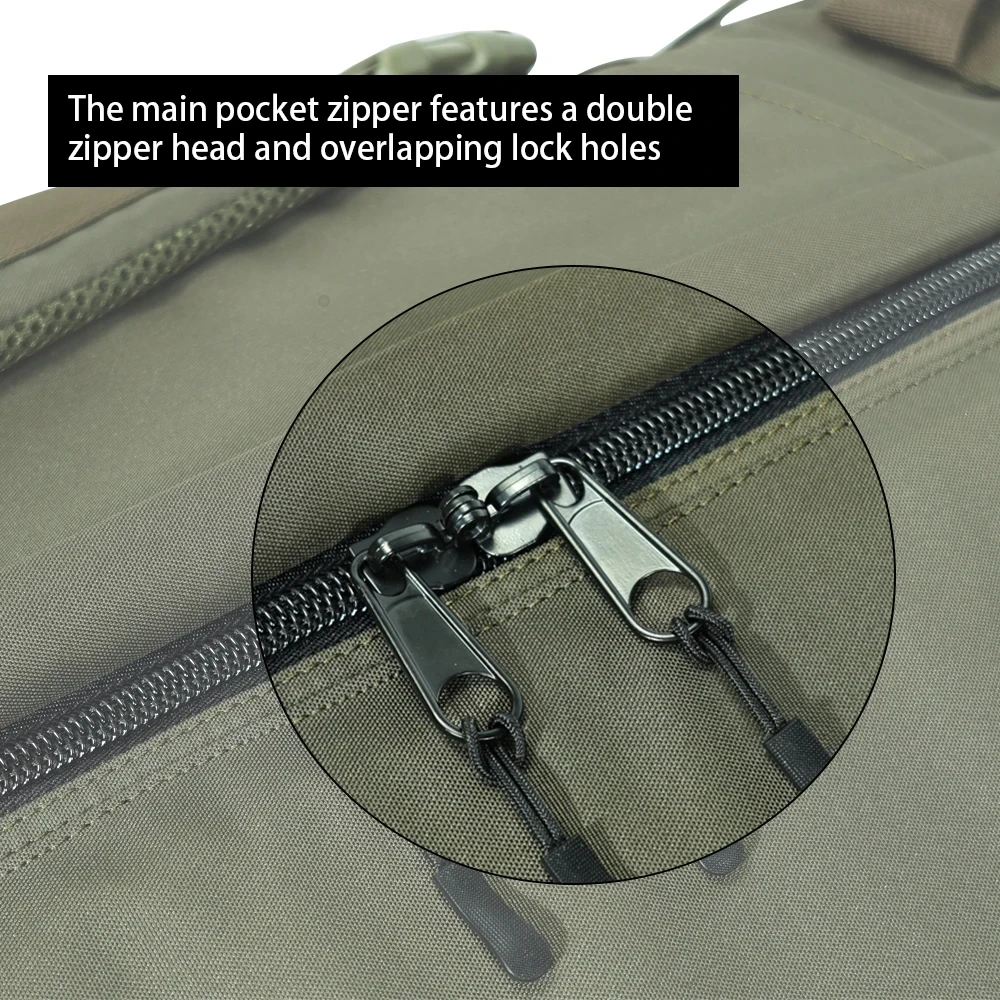 La cremallera del bolsillo principal cuenta con una doble cremallera y orificios de bloqueo superpuestos.