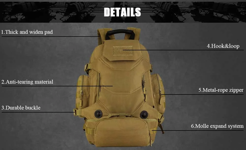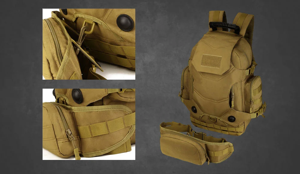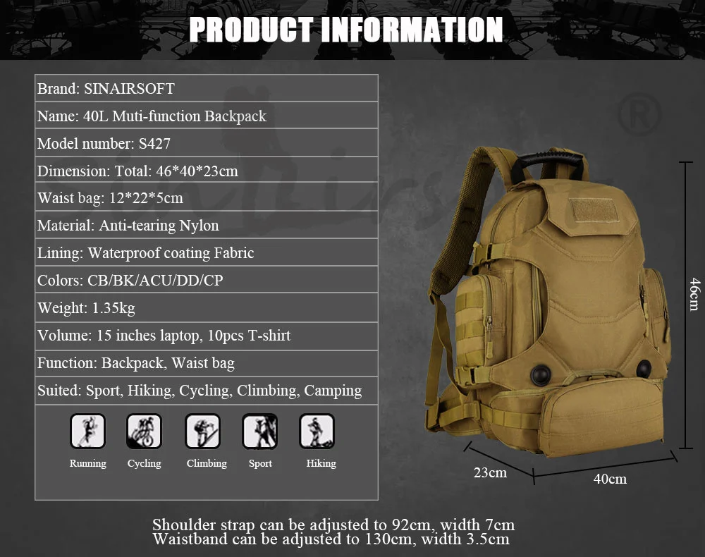 Atenuación: 47*31*23cmMaterial: nailon antidesgarroForro: tela de revestimiento impermeableVolumen: portátil de 14 pulgadas, iPad 4, revistas A4, se puede colocar una camiseta de 10 pulgadas.Función: mochilaAdecuado: ciclismo, escalada, viajes, deporte, CampingLa correa del hombro se puede ajustar a 92cm, ancho 7cm.La cintura se puede ajustar a 130cm, ancho 3,5 cm