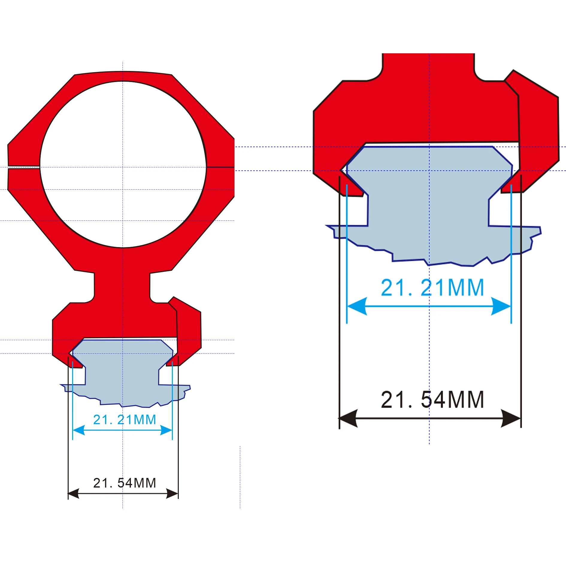 De acuerdo con los dibujos estándar de EE. UU. Knight Ordnance, el ancho de un riel Picatinny es de 21,21 mm - 21,08 mm.Los rieles fuera de esta gama no se ajustan a los estándares internacionales y no se pueden utilizar con nuestros soportes.