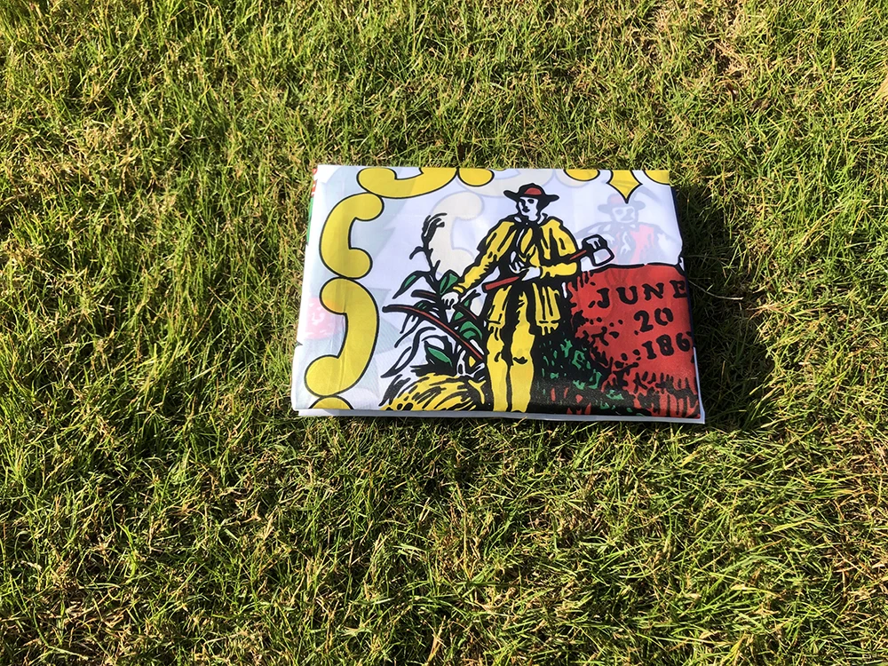Esta bandera de Virginia Occidental muy bien entregada y recibida y de vivos colores tanto por el anverso como por el reverso.