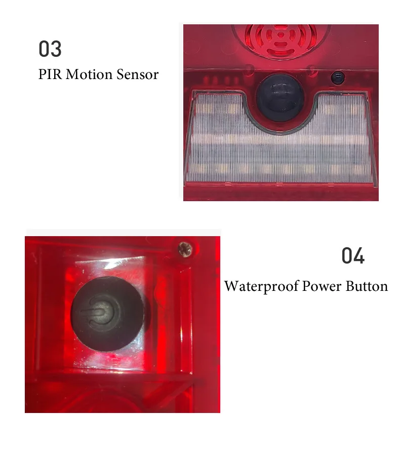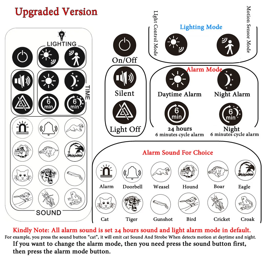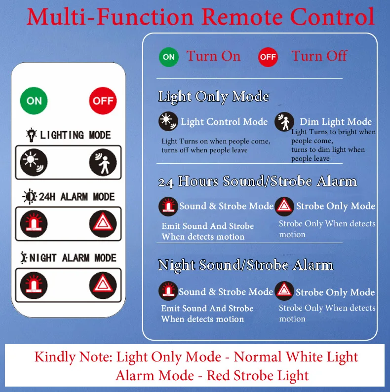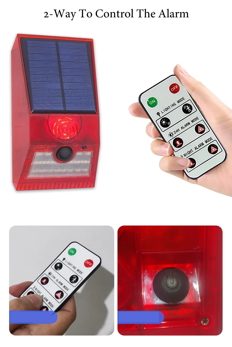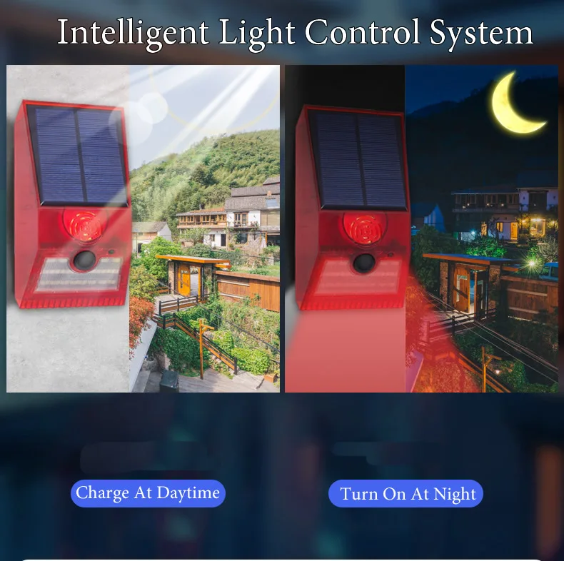 Alarma de movimiento-Cuando alguien entre en el rango de detección, entrará un sonido fuerte y la luz estroboscópica se encenderá para asustar a los crímenes y notificarle