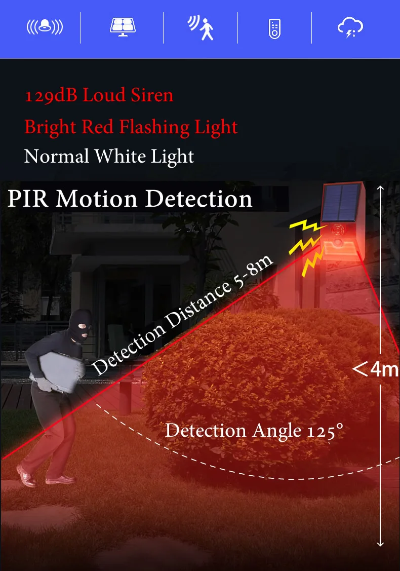 Emite sonido de alarma de 129dB y luz estroboscópica para notificarle de una entrada no autorizada si alguien entra en el área protegida. Es perfecto para el hogar, oficina, garaje, cobertizo, jardín, seguridad agrícola.