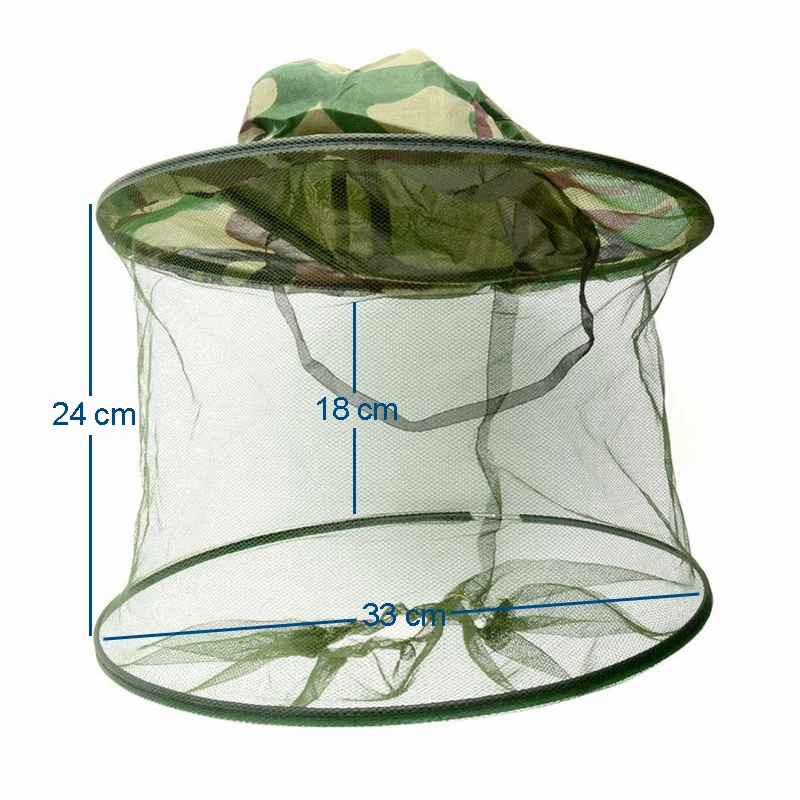 Peso: 45g/0,99 LBAncho y altura: 23 cm/9,05 pulgadasColor: camuflajeLista del paquete: 1 * velo de mantenimiento de abejas Mosquito Hat