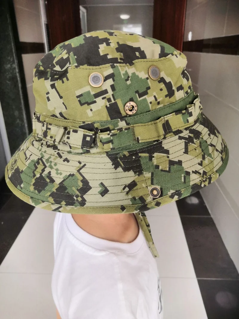 Diseño: Hay 2 grandes orificios de ventilación a cada lado y la parte superior del sombrero está hecha de una sola capa de tela (para aumentar la transpirabilidad), mientras que las otras partes se componen de capas dobles o múltiples de tela.
