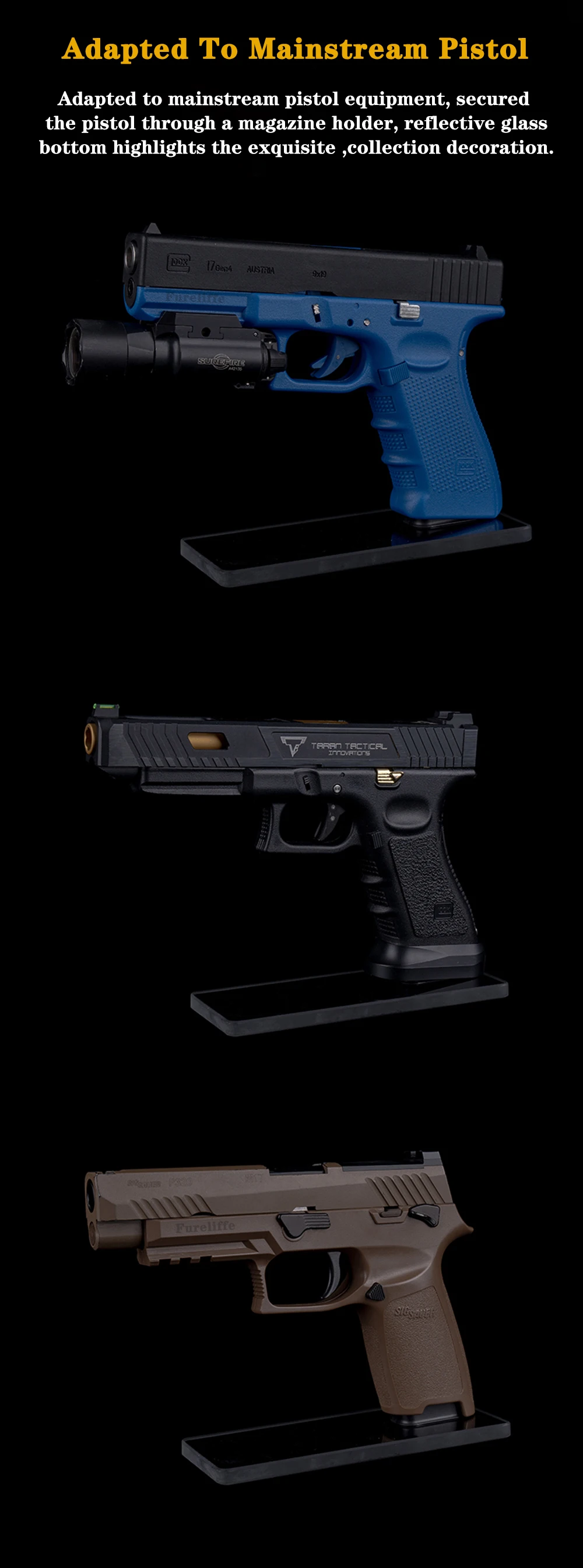 -Adaptado al equipo de pistola convencional, asegurado la pistola a través de un cargador, la parte inferior de vidrio reflectante resalta la exquisita decoración coleccionable.