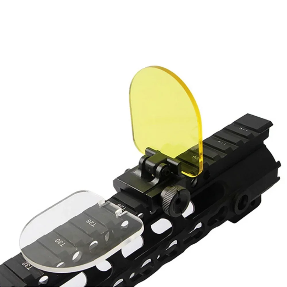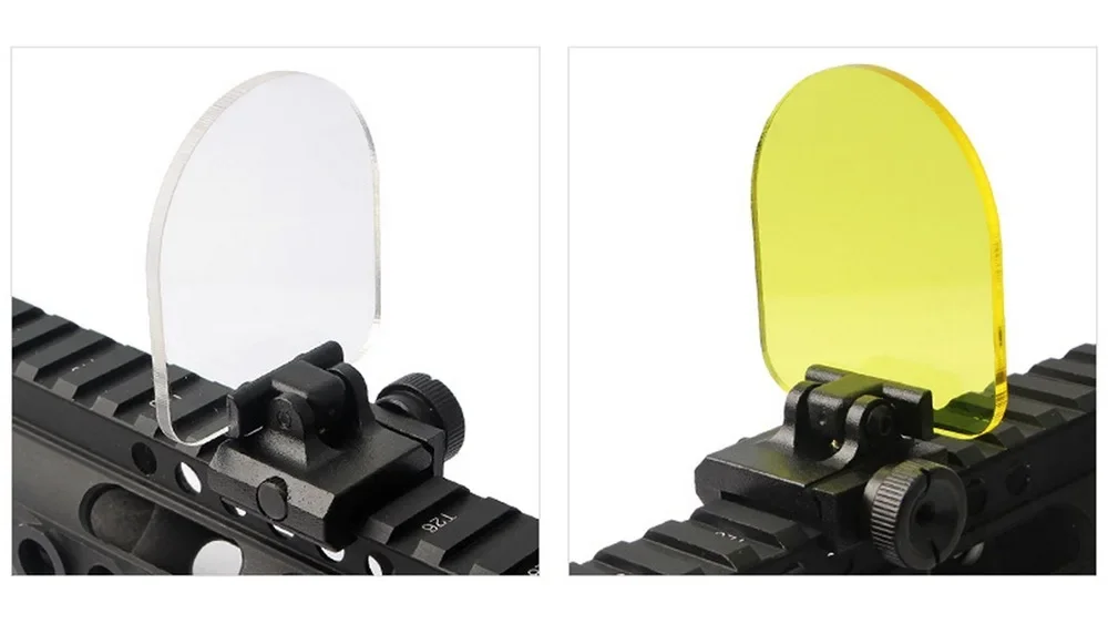 Protector de lente y miras de punto rojo protector de lente Lentes amarillas blancas cada uno, Hecho en acrílico de 3mm con soporte de metal. Evite dañar la mira holográfica. Diseño abatible. Viene con pantalla clara y amarilla. Base de montaje QD de 20mm. Se atornilla a un riel Weaver / Picatinny estándar de 20mm Viene con 2 protectores Perspex-Claro y Amarillo Fácil de instalar, se pliega cuando no está en uso. Después de recibir los productos, la película fina en la superficie de la definición recortada será mejor. Para el impacto de las pistolas eléctricas de juguete
