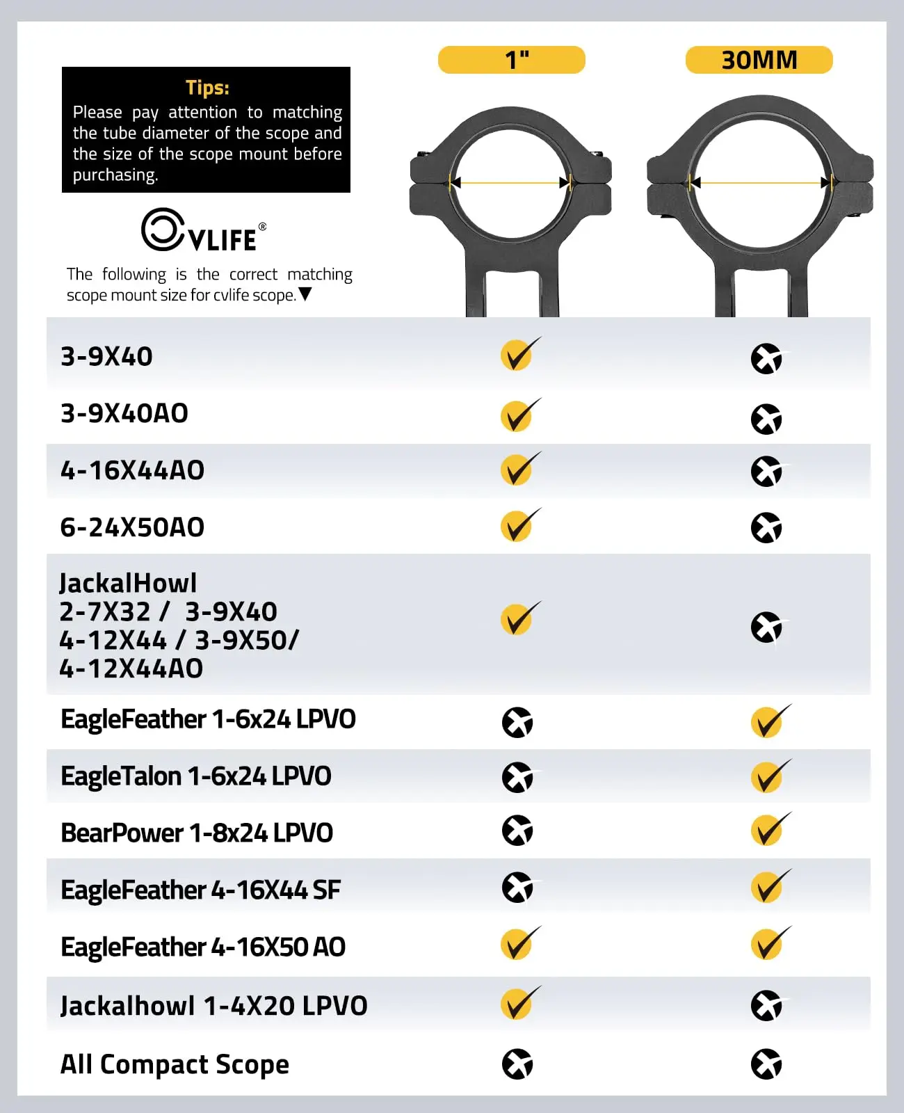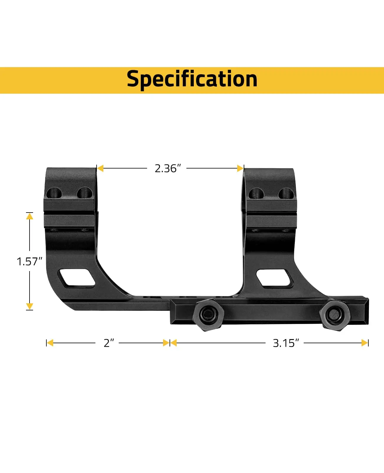 Especificaciones: El soporte presenta un espacio entre anillos de 2,36 pulgadas, altura central del anillo de 1,57 pulgadas y longitud de la base de 3,15''. Este soporte para visor no es adecuado para visores con un espacio de anillo de más de 2,36"